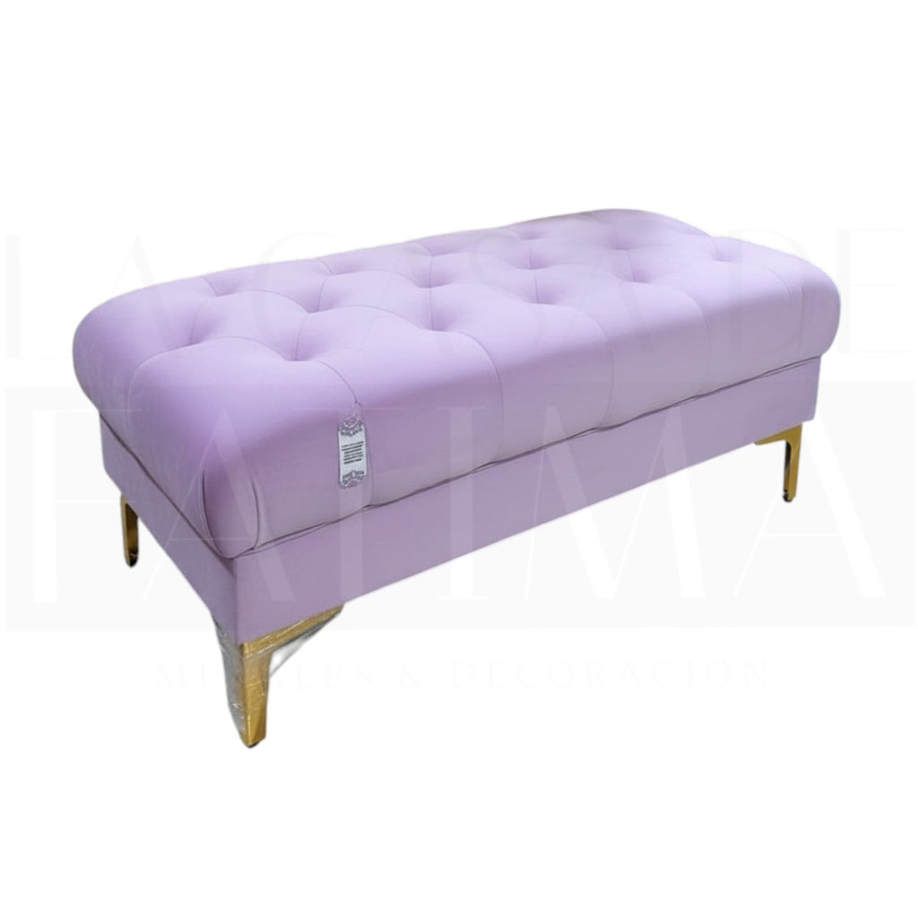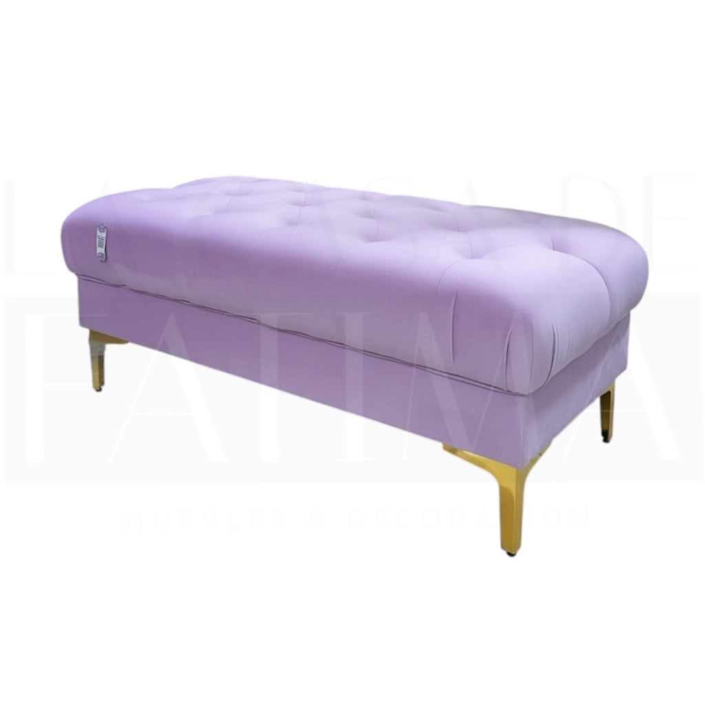 Dale un toque soft glam a tu living o dormitorio con esta banqueta tapizada en felpa color lila y terminado capitoné, perfecta para sumar textura, calidez y un punto de color elegante. Sus patas metálicas doradas levantan el diseño y lo hacen ver liviano y sofisticado, ideal para complementar espacios neutros o crear un acento protagonista.