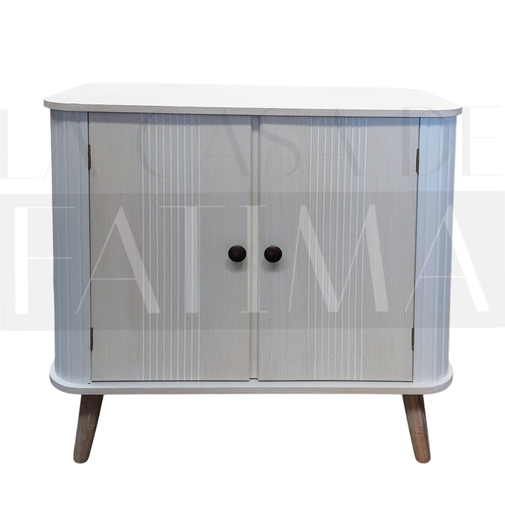 Un mueble compacto y elegante que suma almacenamiento y estilo a cualquier ambiente. Su acabado blanco envejecido y la cubierta en tono albayalde crean un look delicado y luminoso, mientras que los tiradores metálicos y las patas cónicas aportan un toque retro contemporáneo.