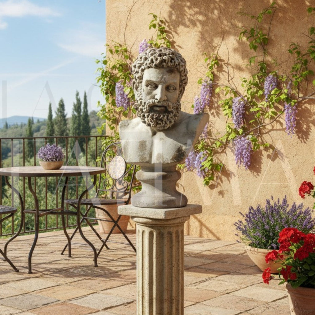 Inspirado en la estatuaria clásica, este busto de Hércules aporta carácter escultórico y un aire museístico a entradas, livings o bibliotecas. La pátina envejecida resalta la textura del cabello y la barba, logrando una pieza imponente y muy decorativa.