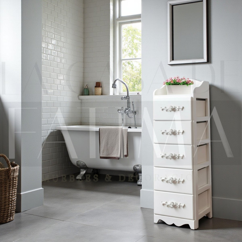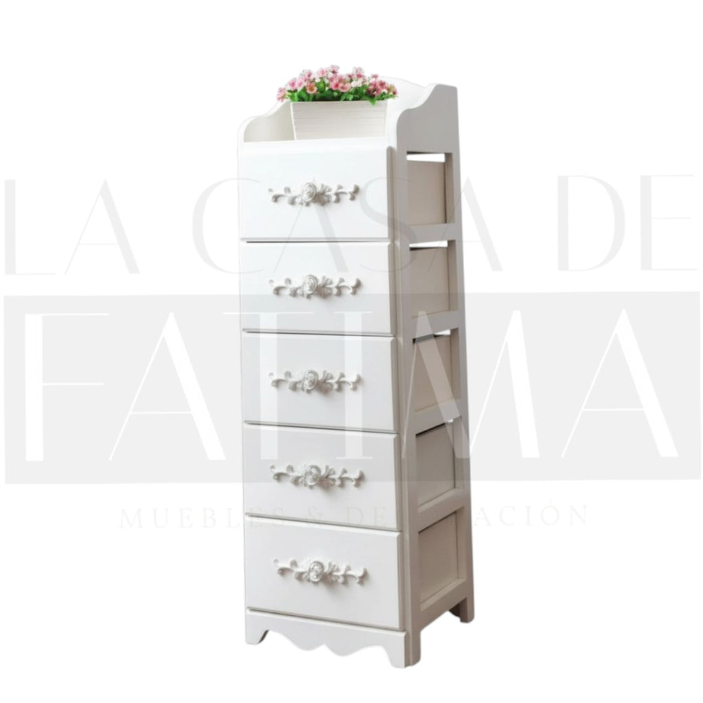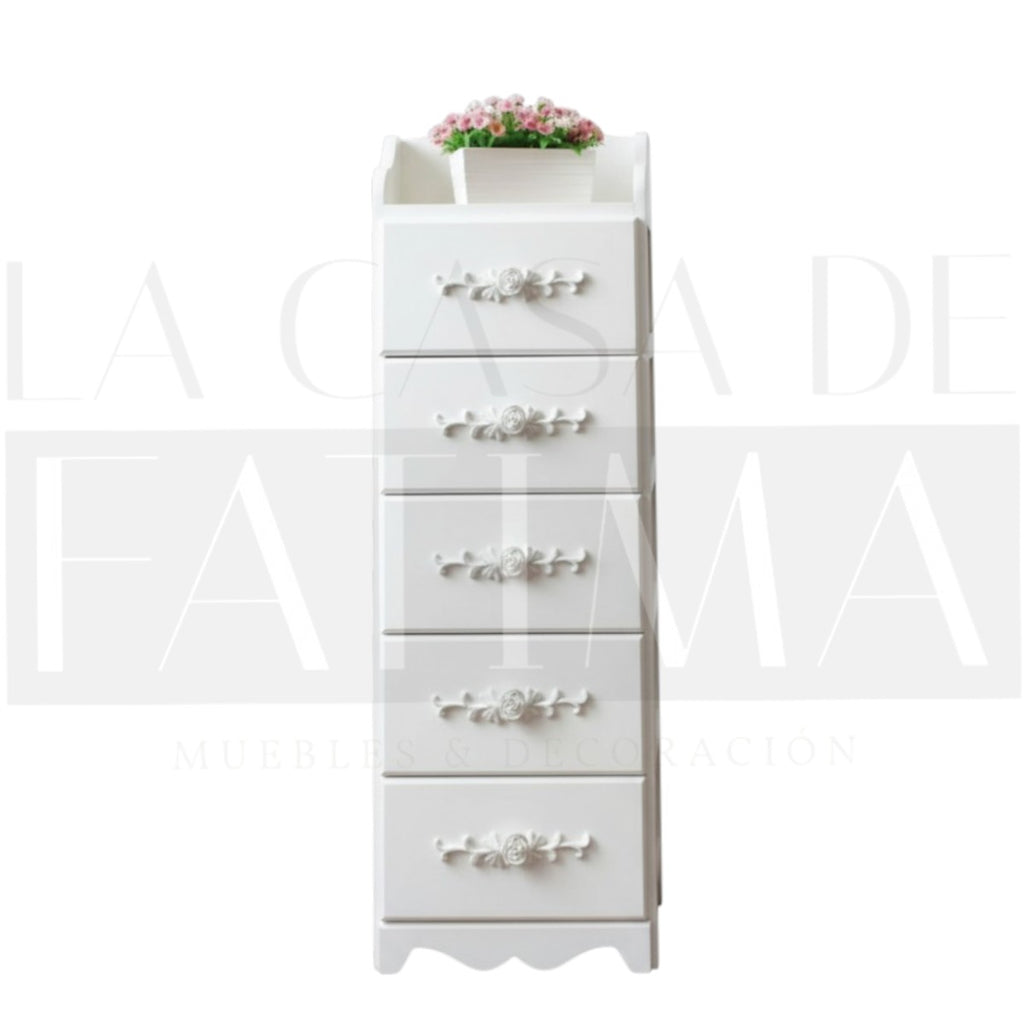 Ordena tus espacios con estilo romántico. Este mueble alto y delgado en MDF lacado blanco incluye 5 cajones con apliques florales en relieve, ideal para dormitorio, baño, hall o ese rincón que necesita almacenamiento sin perder elegancia.