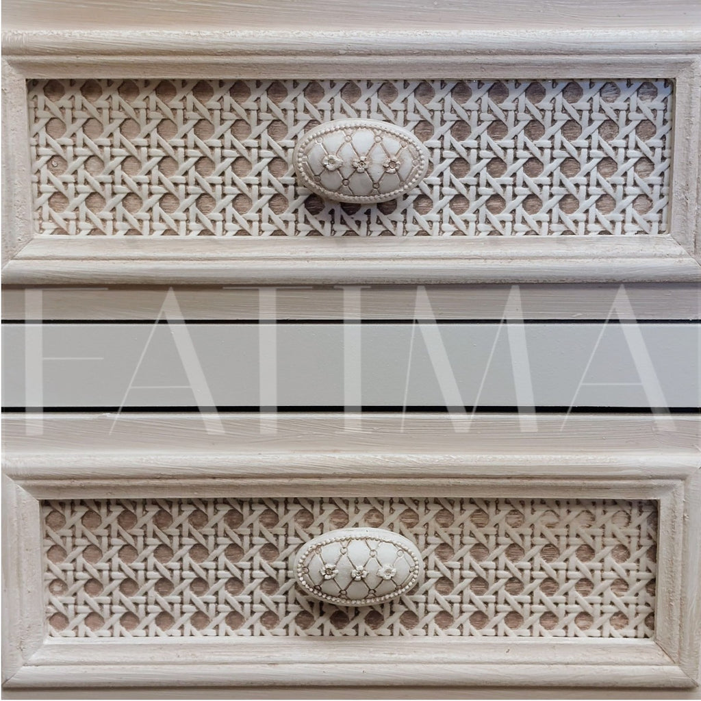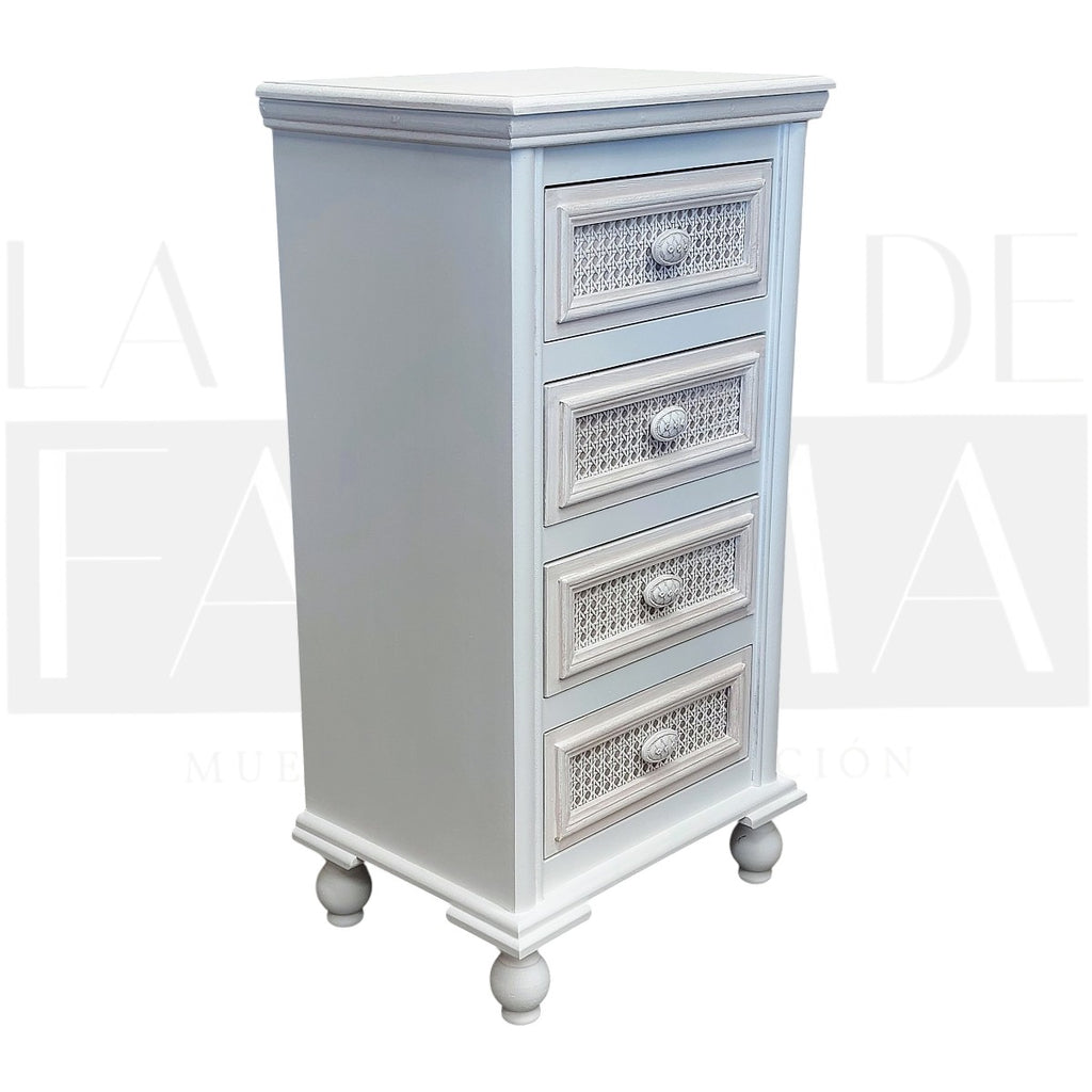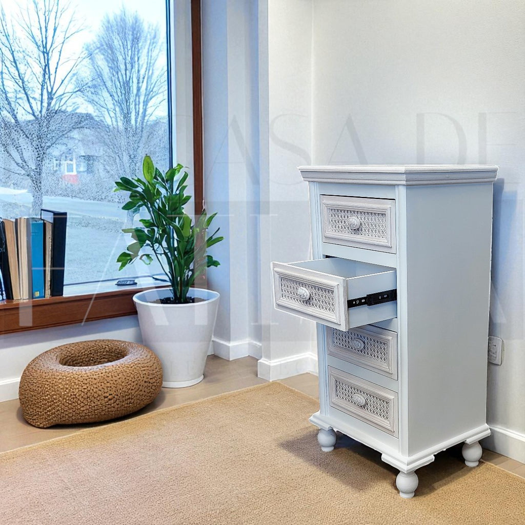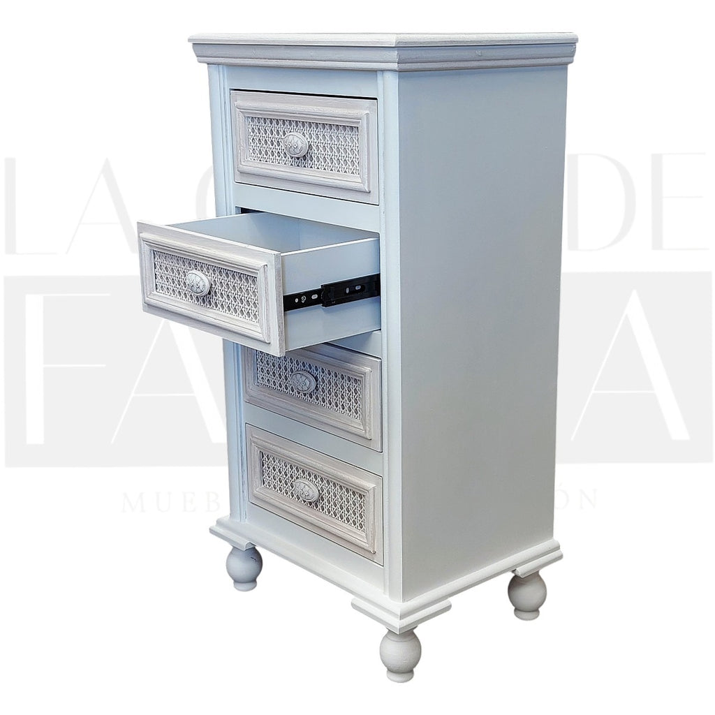 Su frente con aplicaciones de junco (rattan) aporta textura y un look artesanal, mientras que los tiradores de madera y los cajones con rieles aseguran uso cómodo y duradero.
