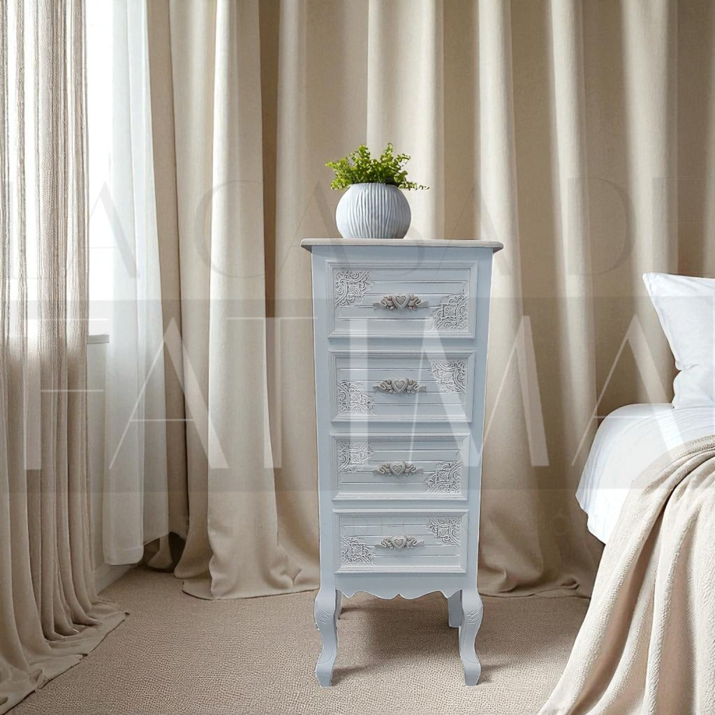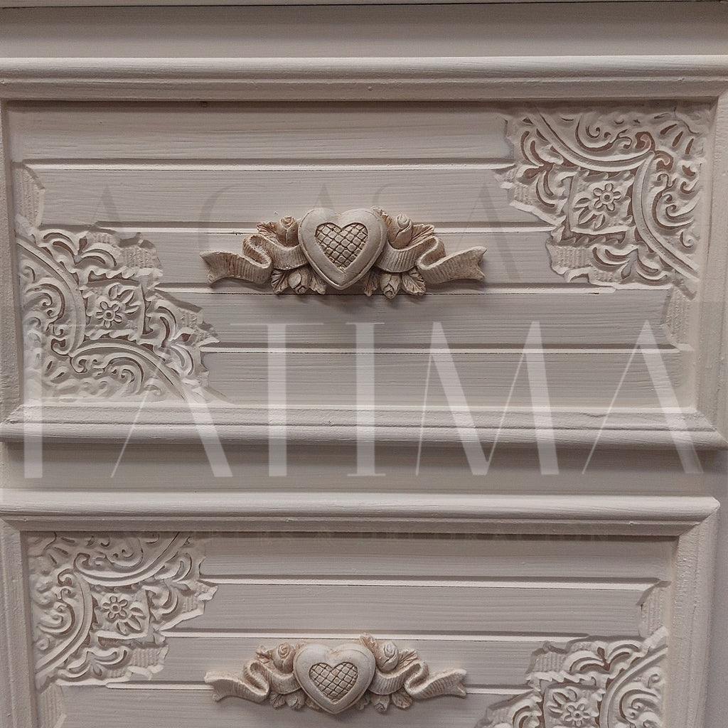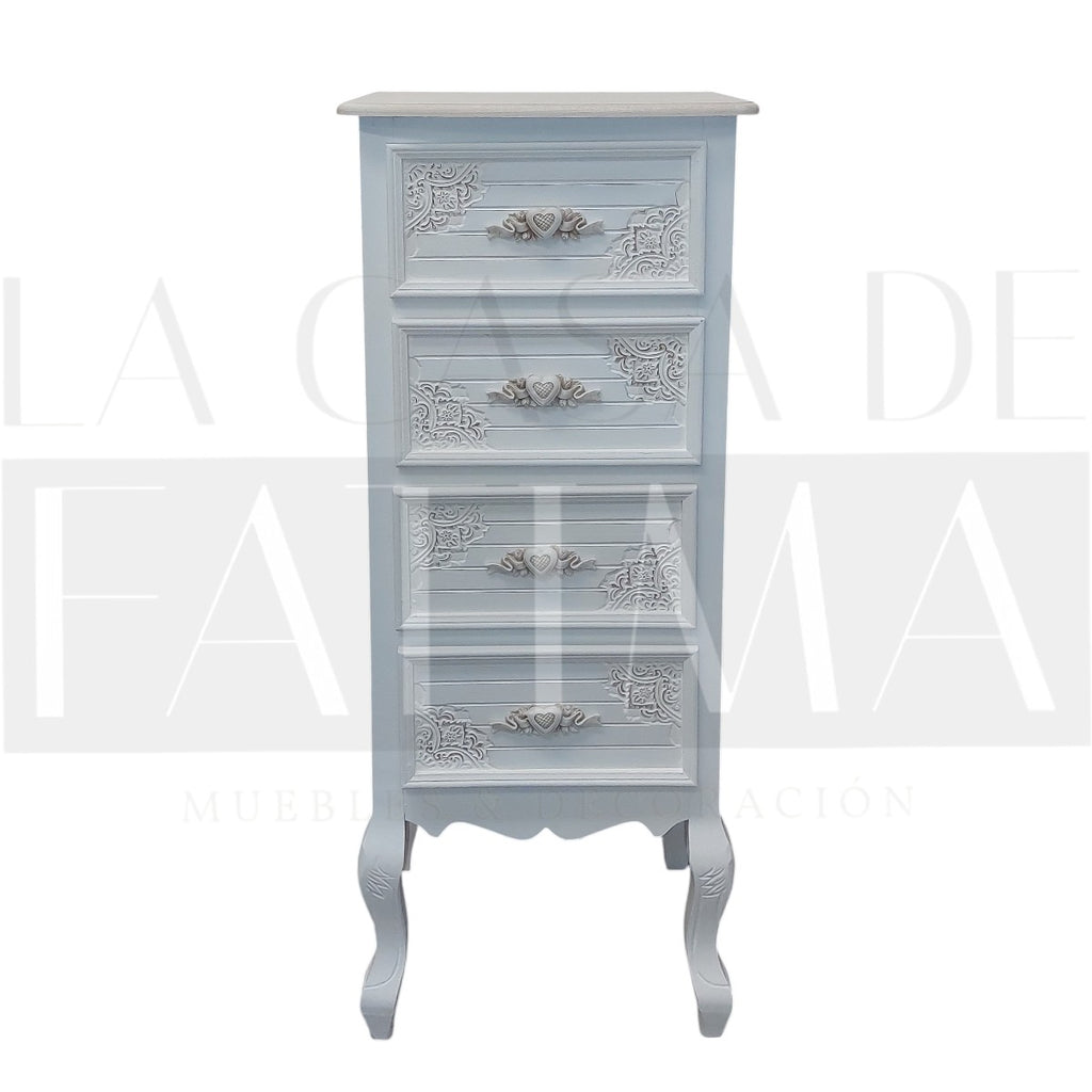 Lleva el encanto del estilo clásico francés a tu hogar con la Cajonera Provenzal Heart de 4 cajones.