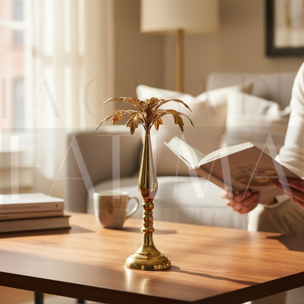 Un acento tropical y elegante para tu mesa o arrimo. Este candelabro metálico con forma de palmera aporta brillo dorado y sombras decorativas que crean atmósferas cálidas en living, comedor o terraza techada.