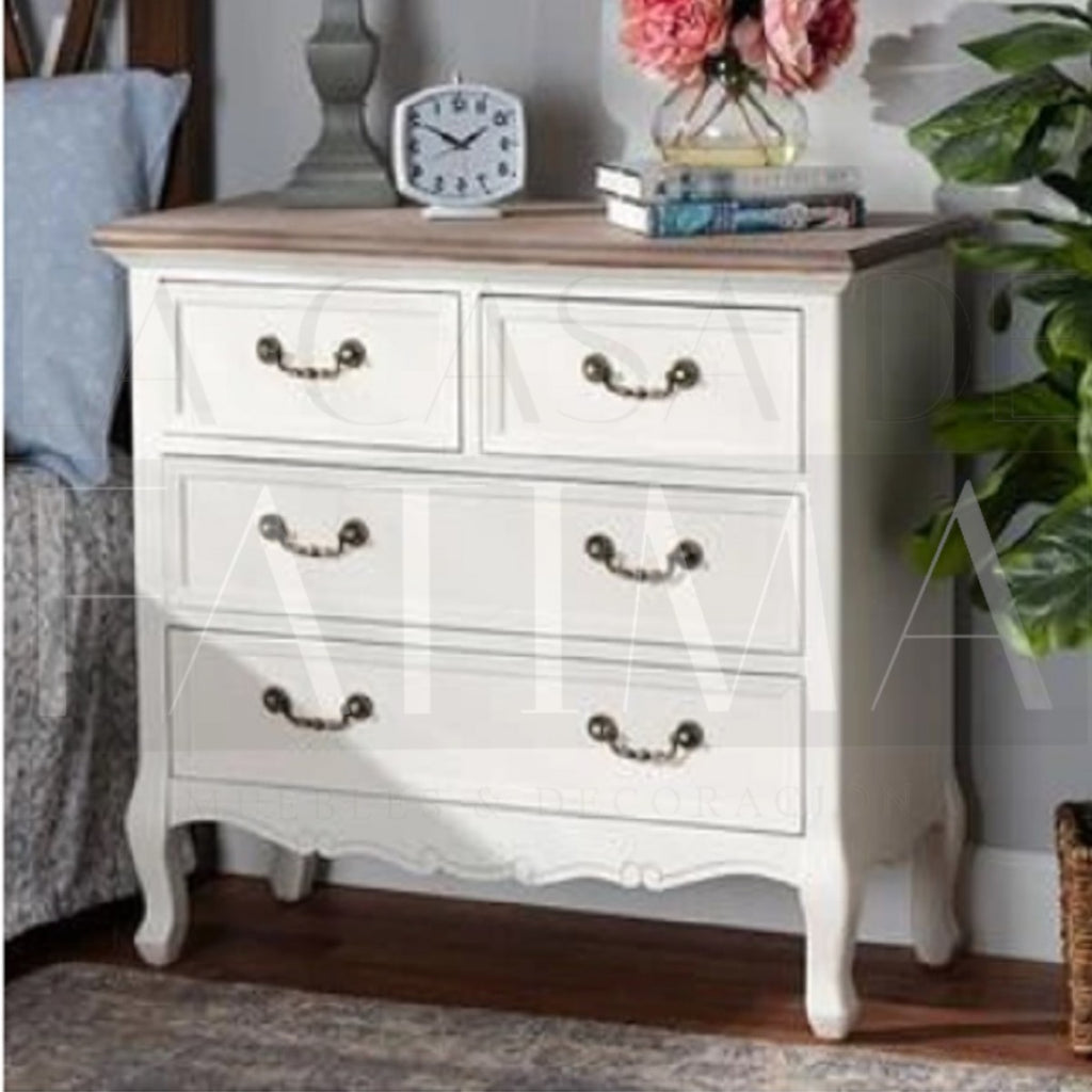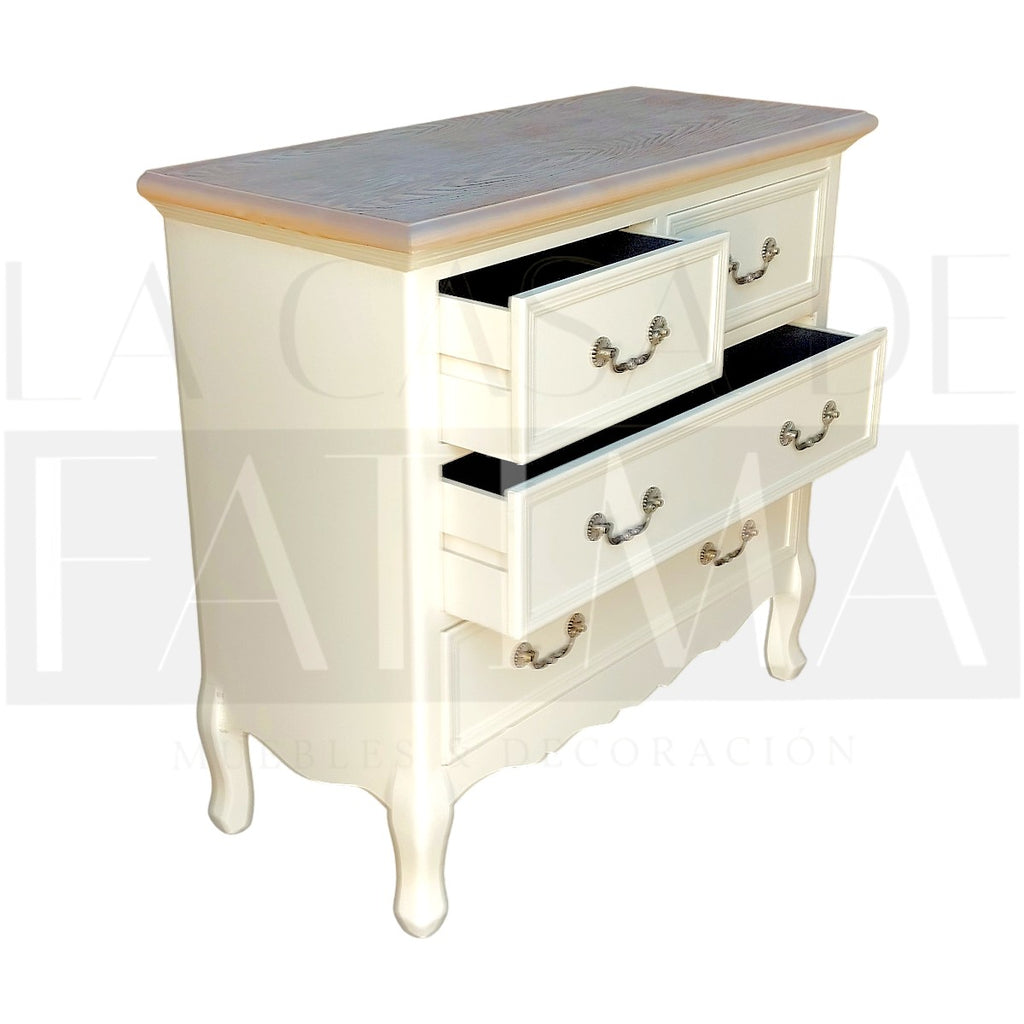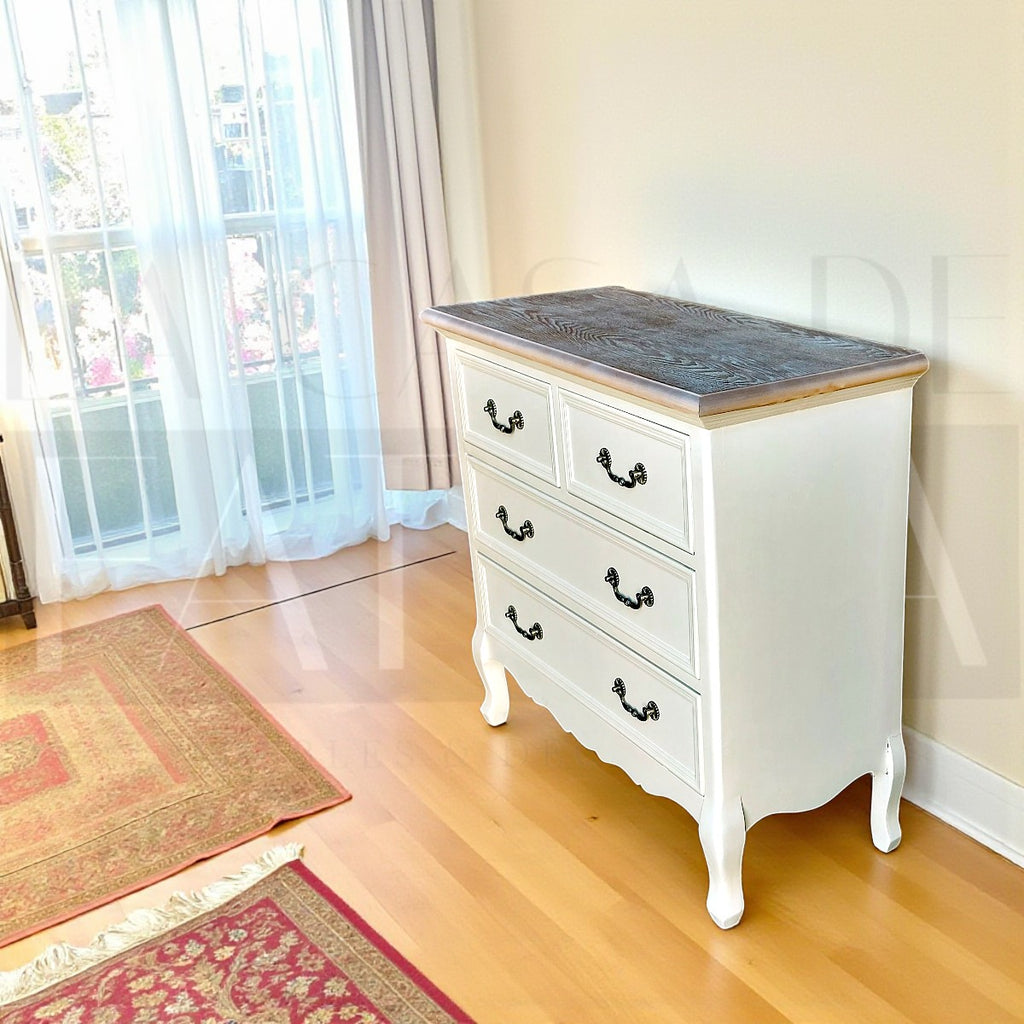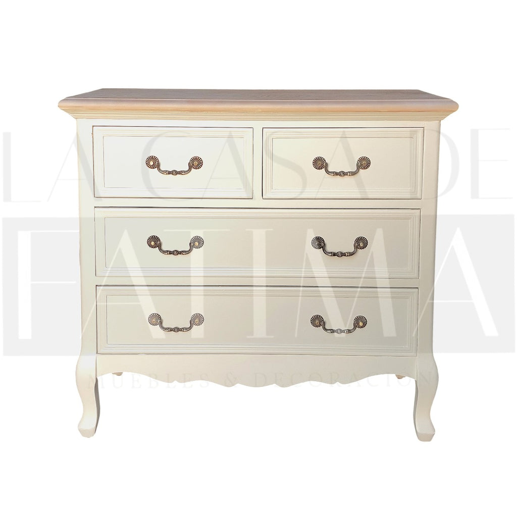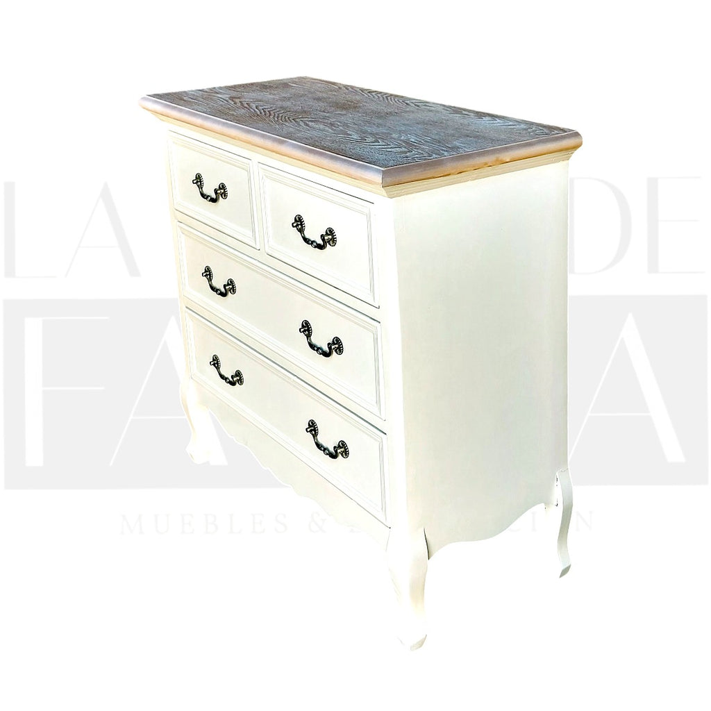 Clásica, elegante y muy funcional. La Cómoda Normando aporta carácter francés a tu dormitorio o hall de entrada con su silueta curvada y tiradores estilo vintage. Fabricada en madera para mayor solidez y terminada con cubierta en acabado albayalde, combina fácilmente con tonos neutros o propuestas más cálidas.