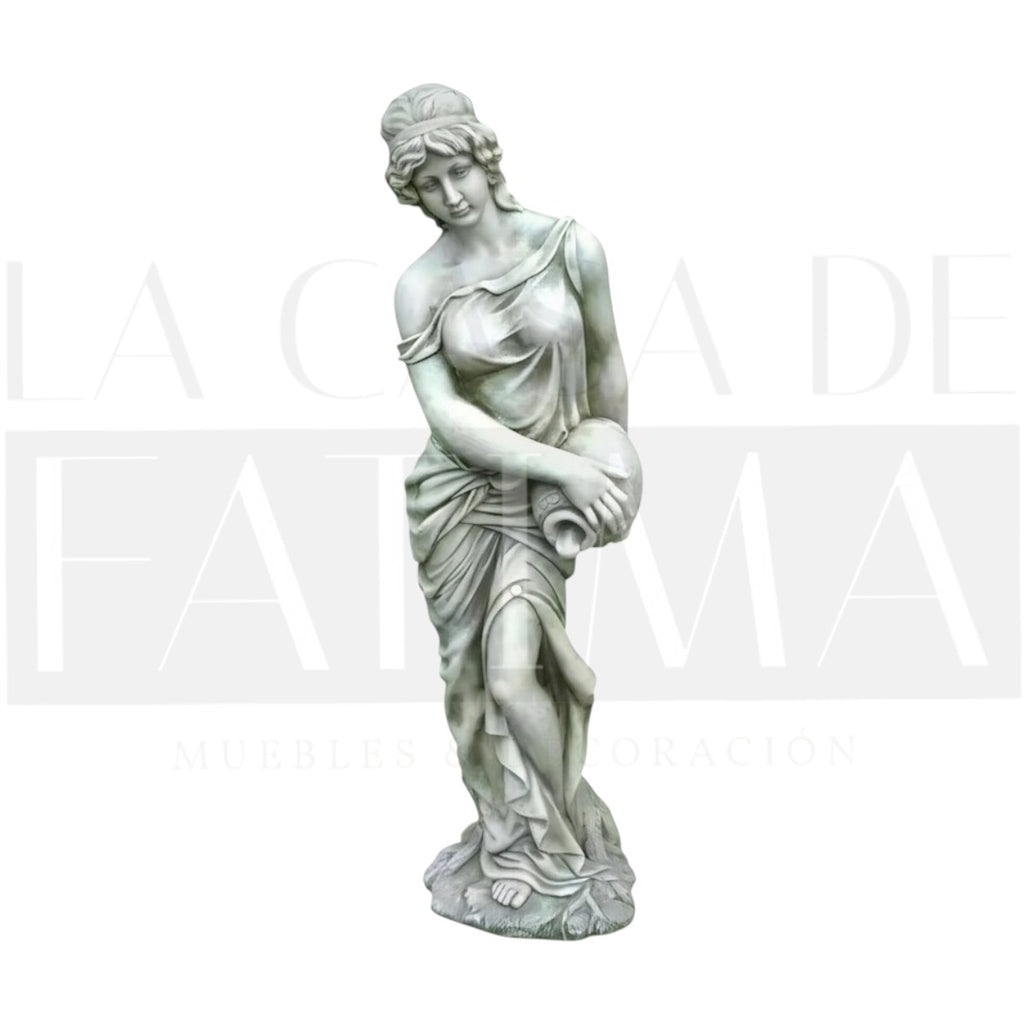Una pieza de inspiración grecorromana que aporta serenidad y elegancia a jardines, terrazas o halls. Su acabado envejecido resalta los pliegues del vestido y la curva del ánfora, creando un foco decorativo lleno de carácter.