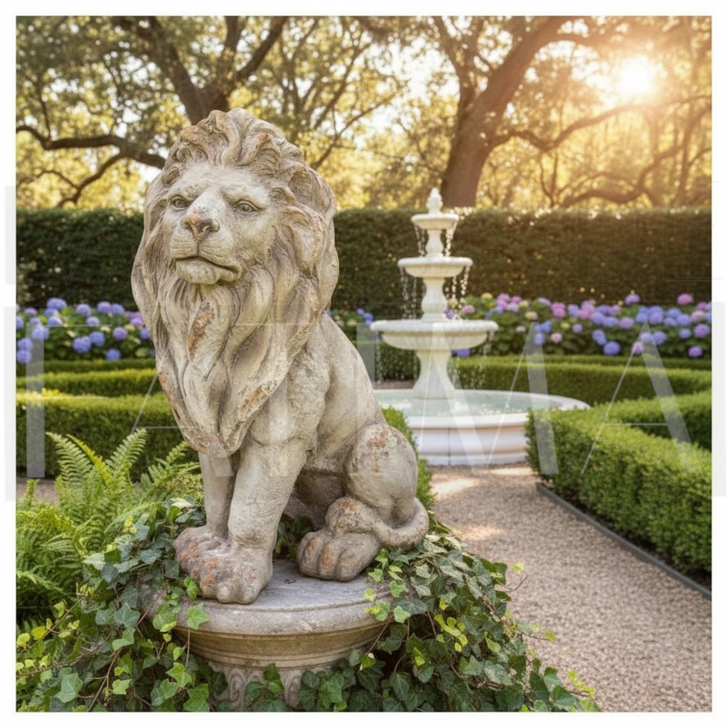 Su melena bien definida y gesto sereno transmiten fuerza y elegancia clásica, ideal para ambientaciones mediterráneas o provenzales. Resistente y estable, luce perfecto en dúo flanqueando accesos o como pieza protagonista sobre un pedestal.