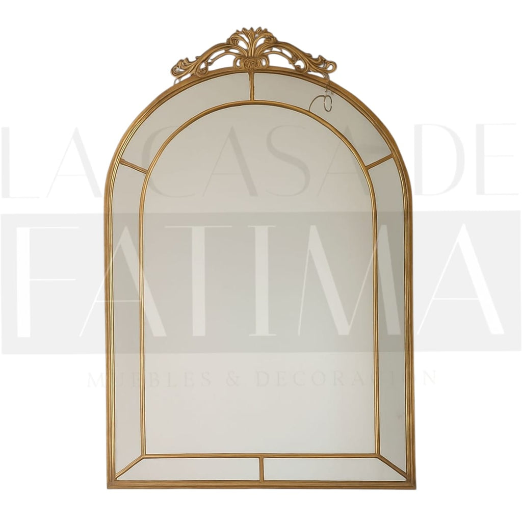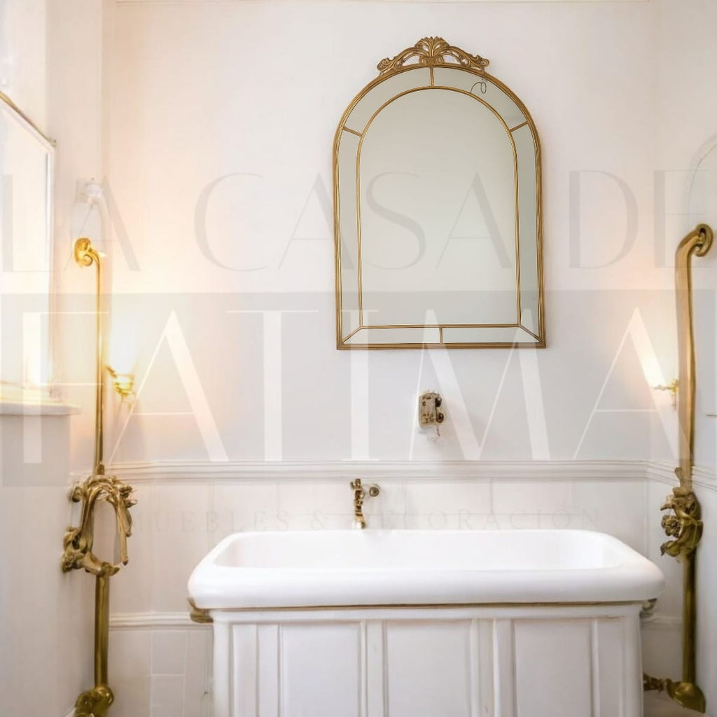 Dale un toque de elegancia clásica a tu hogar con este Espejo Decorativo marco Metálico Dorado, diseñado para destacar. Su forma arqueada y detalles ornamentales hacen de este espejo una pieza única, ideal para realzar la decoración de cualquier espacio.