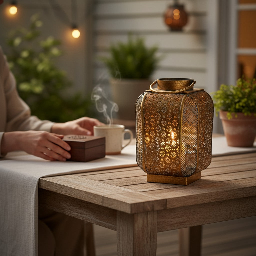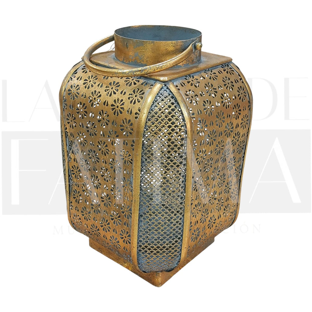 Crea atmósferas cálidas al instante. Este Fanal Metálico Calado Dorado con calado floral proyecta un juego de luces precioso en terrazas, entradas o livings.