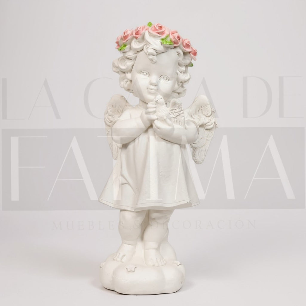 Tierno y luminoso, este angelito con corona de rosas y palomita en las manos aporta dulzura a cualquier rincón: velador, arrimo o repisa del living. Su acabado blanco con delicados toques de color combina perfecto con estilos romántico y mediterráneo.