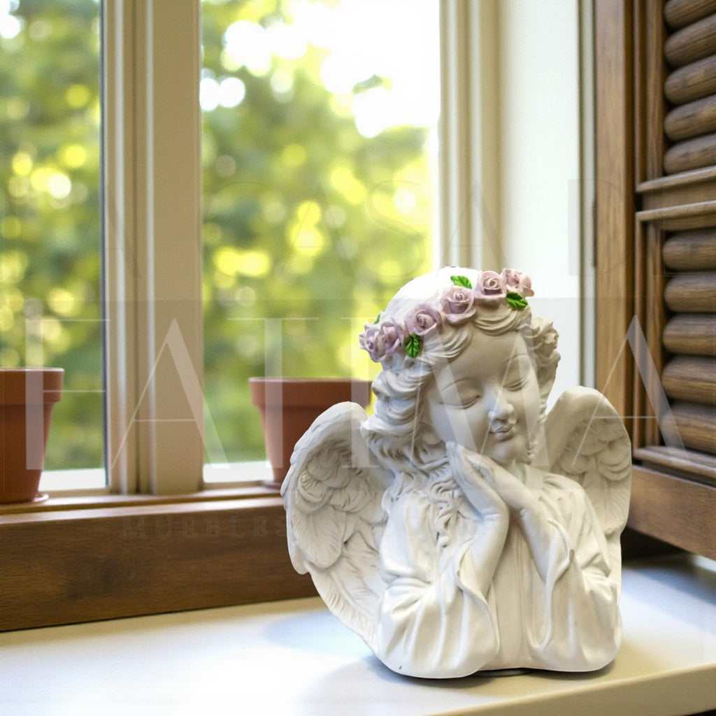 Un detalle tierno y luminoso para tus rincones. Este angelito en posición de oración, con alas detalladas y corona de rosas lila, aporta serenidad a veladores, repisas o mesas de entrada.