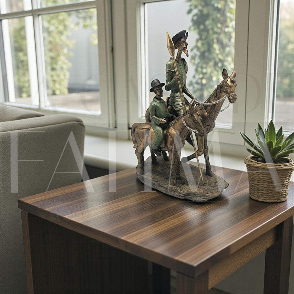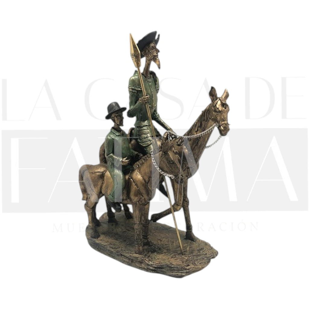Lleva a casa esta escena clásica: Don Quijote a caballo junto a Sancho Panza. Una figura de poliresina con acabado metálico que aporta historia, carácter y un toque artístico a tu living, escritorio o biblioteca.