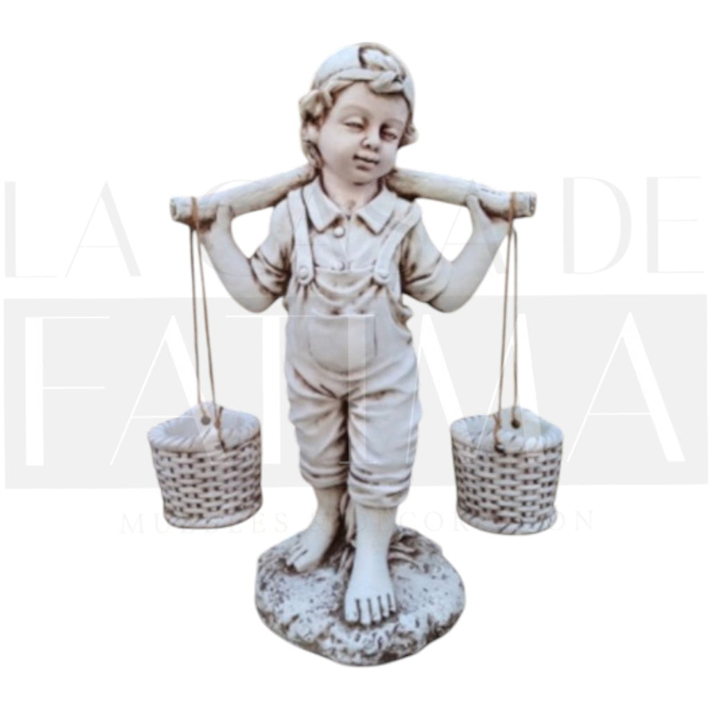 Dale un toque tierno y campestre a tu jardín, terraza techada o hall. Esta figura del niño con canastos colgantes luce acabado blanco envejecido y gran nivel de detalle: perfecta para un rincón provenzal.