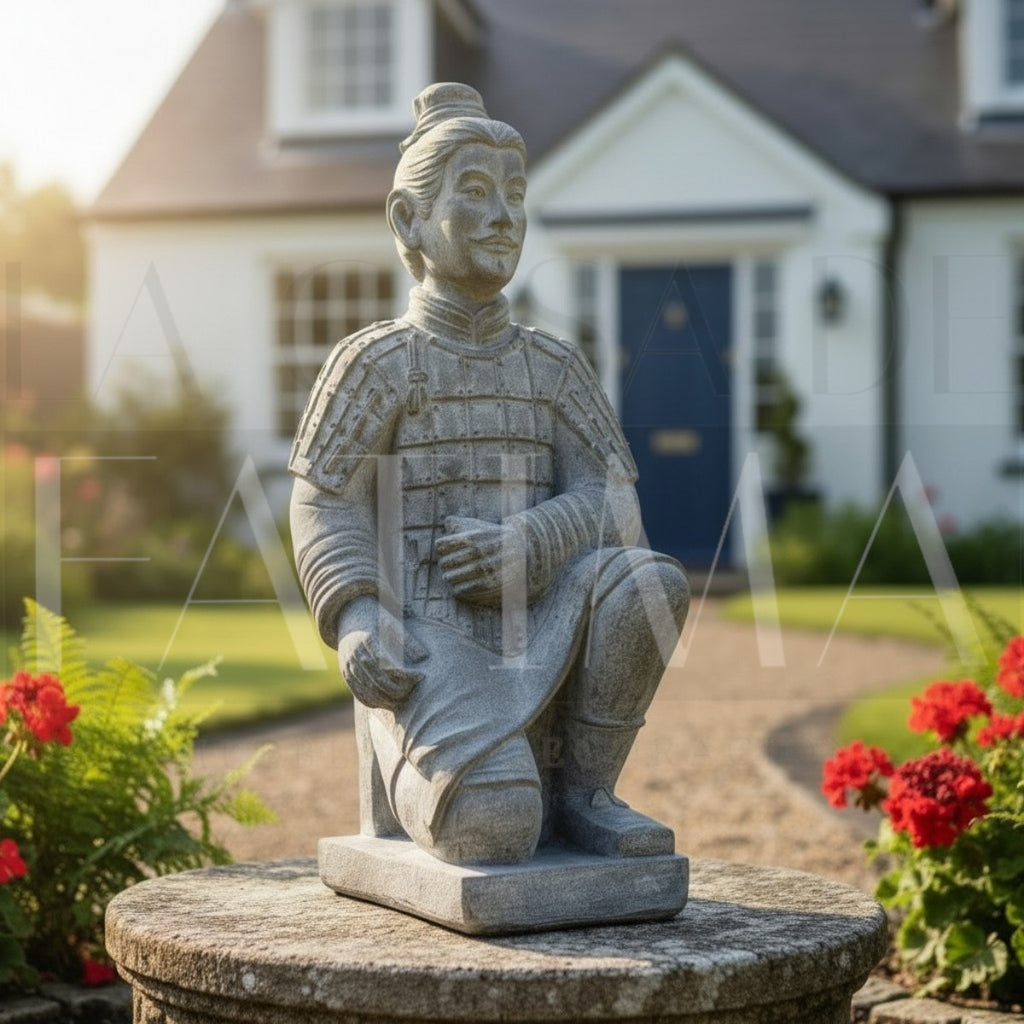 Su postura arrodillada, los detalles del traje y su terminación tipo piedra aportan presencia y estilo, convirtiéndola en un acento perfecto para living, hall de entrada, oficina o espacios con decoración ecléctica y moderna.