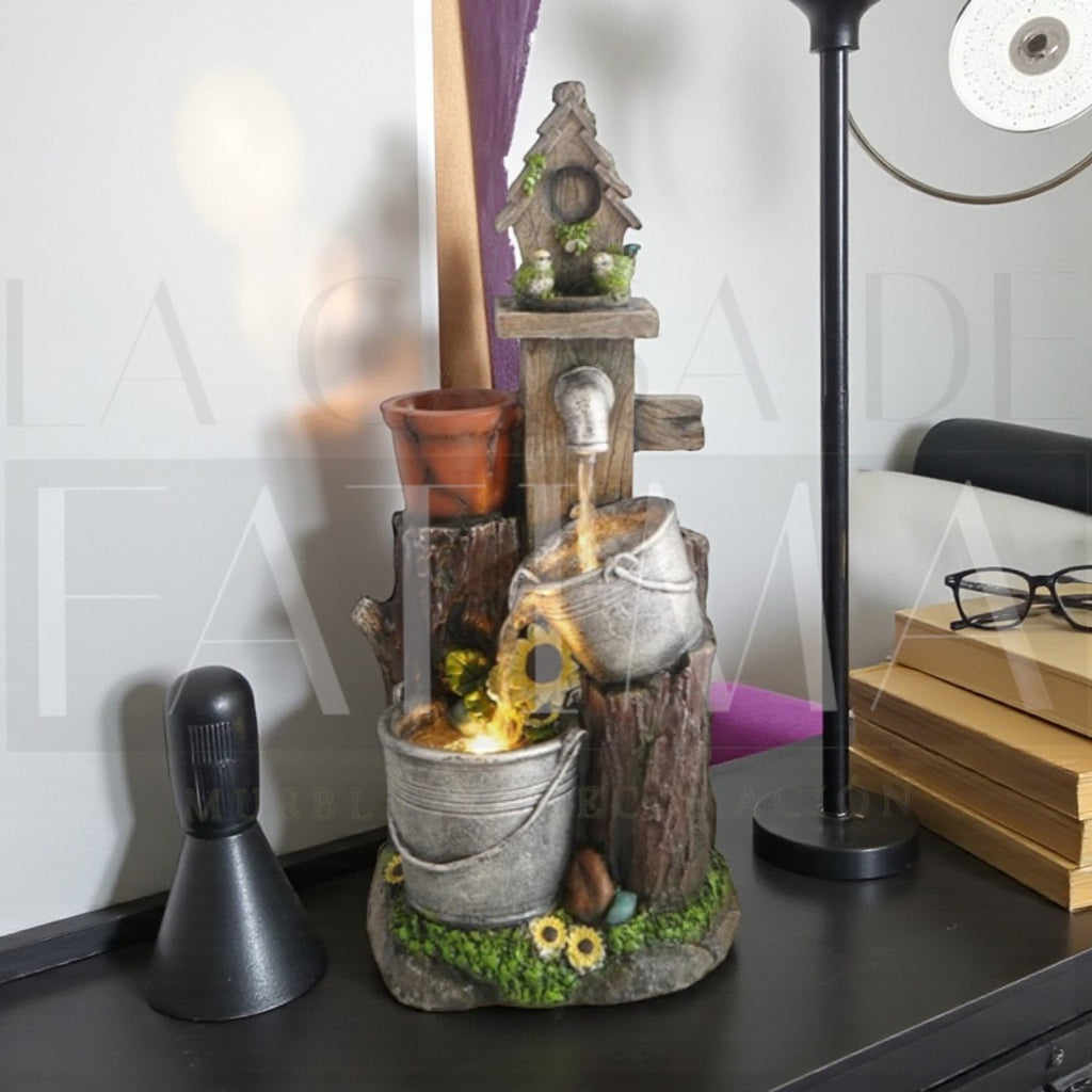 Dale vida y movimiento a tu terraza, living o recibidor con esta encantadora fuente de agua de poliresina estilo rústico. Su diseño de baldes y troncos crea una caída de agua continua que aporta relajo y ambientación sonora al instante.