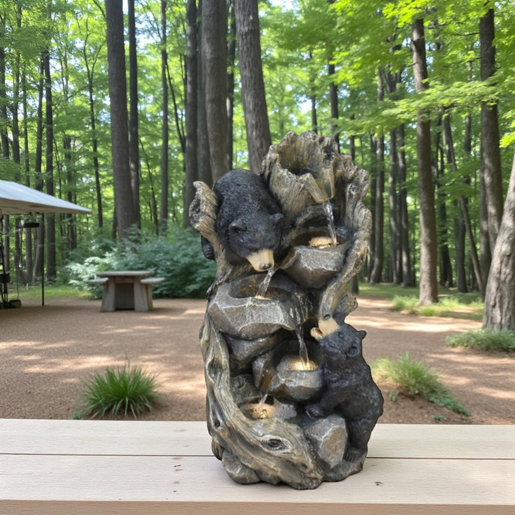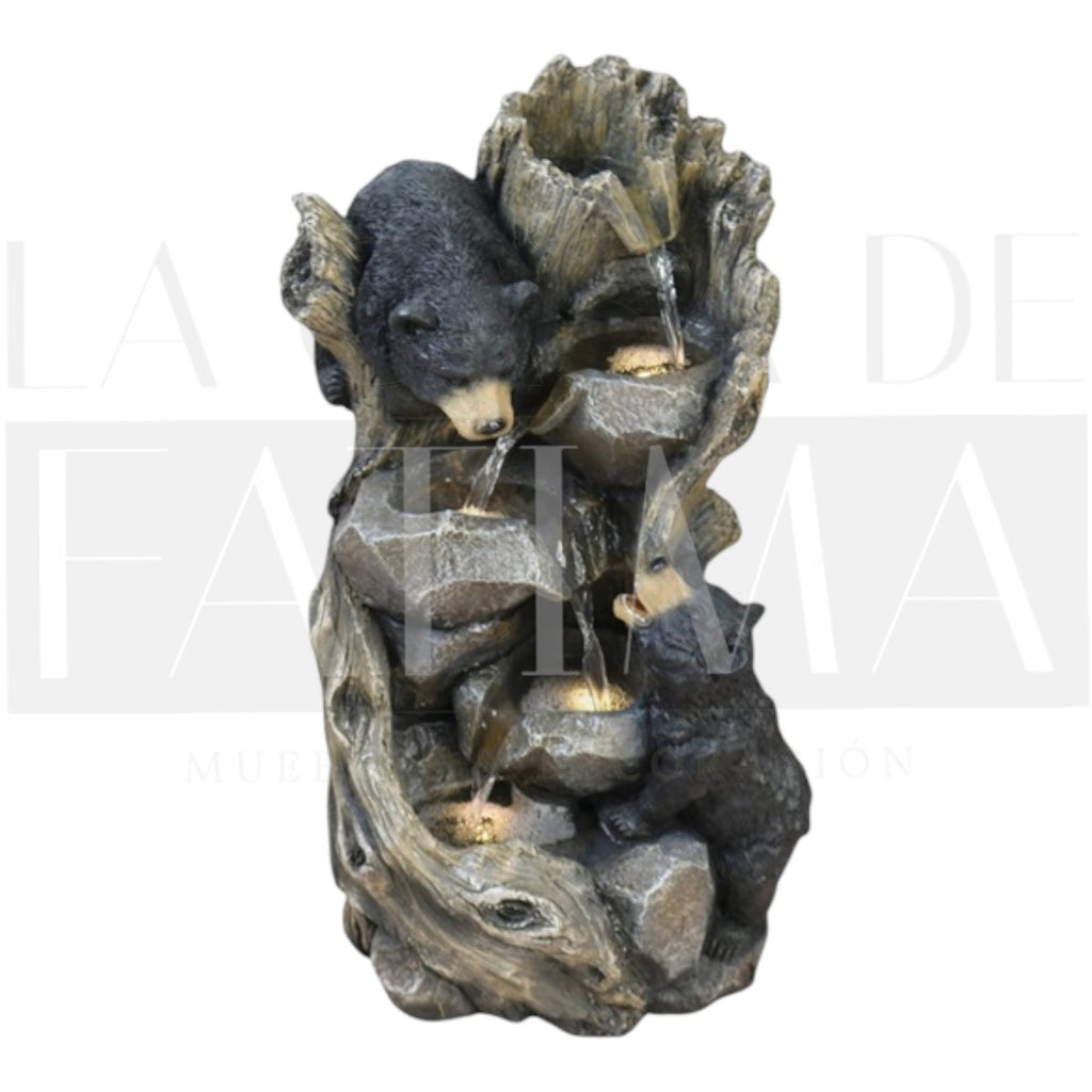 Lleva el encanto del bosque a tu hogar con esta fuente de agua escultórica: una escena de osos pardos entre rocas y troncos con luz por donde el agua desciende en pequeñas cascadas, creando un murmullo relajante que transforma cualquier ambiente.