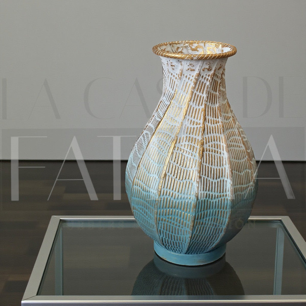 Dale un golpe de estilo a tu living, hall o dormitorio con este jarrón de metal trabajado. Su cuerpo acanalado y el acabado degradé turquesa con detalles dorados envejecidos aportan brillo y carácter artesanal, combinando perfecto con decoraciones clásicas, boho o mediterráneas.