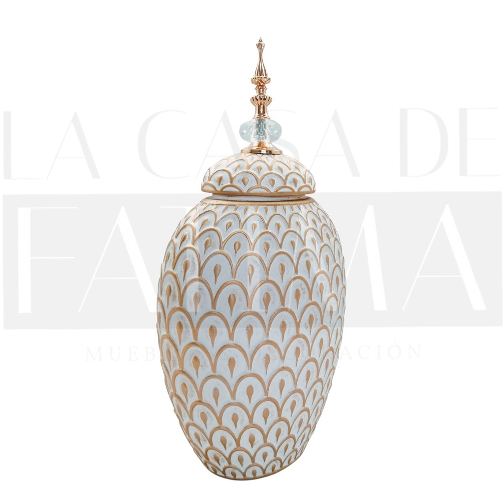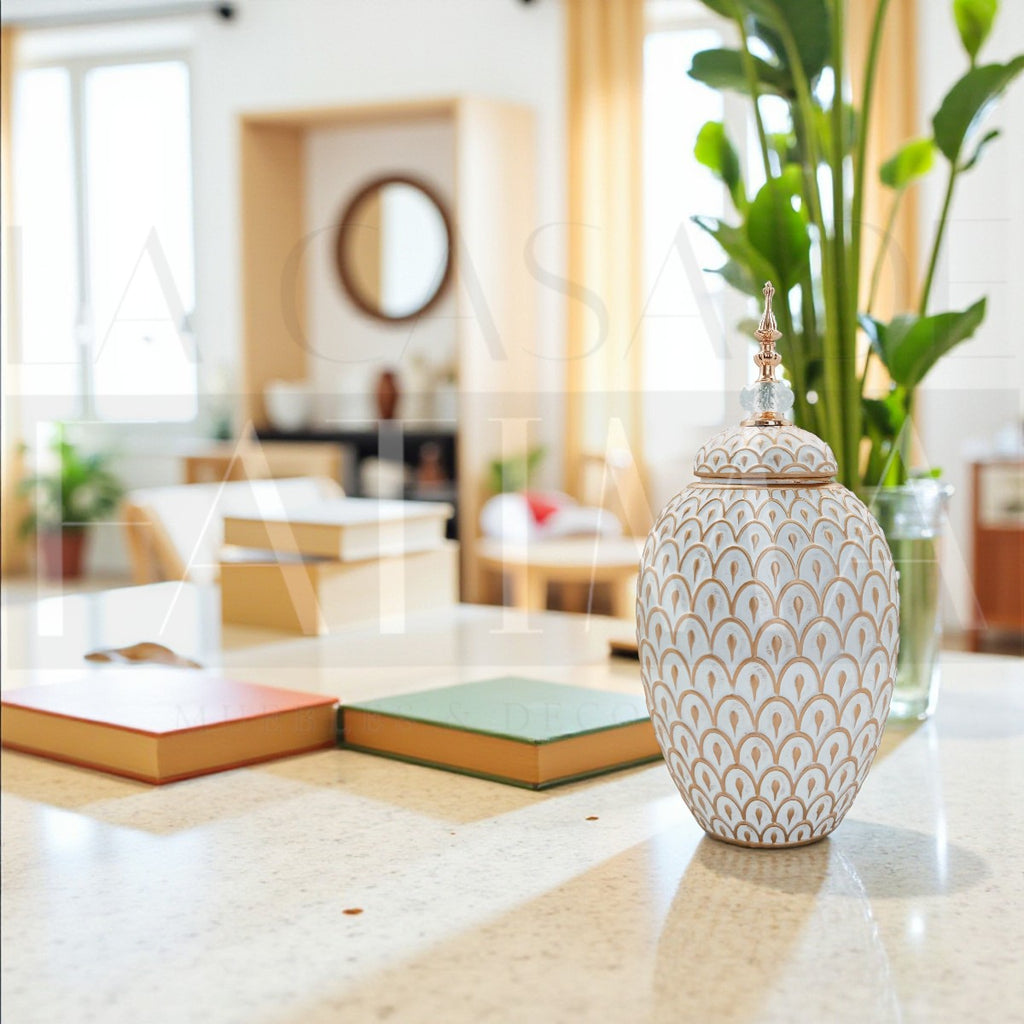 Eleva al instante cualquier espacio con este jarrón ovalado de cerámica, acabado en blanco y dorado envejecido. Su diseño en relieve tipo escamas y la tapa con remate decorativo (detalle transparente tipo cristal) aportan brillo y un aire clásico–glam perfecto para salas, recibidores o dormitorios.
