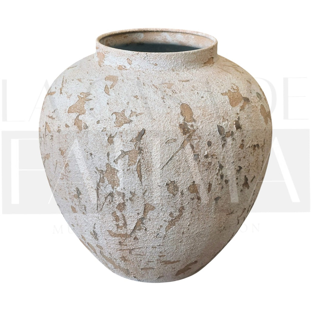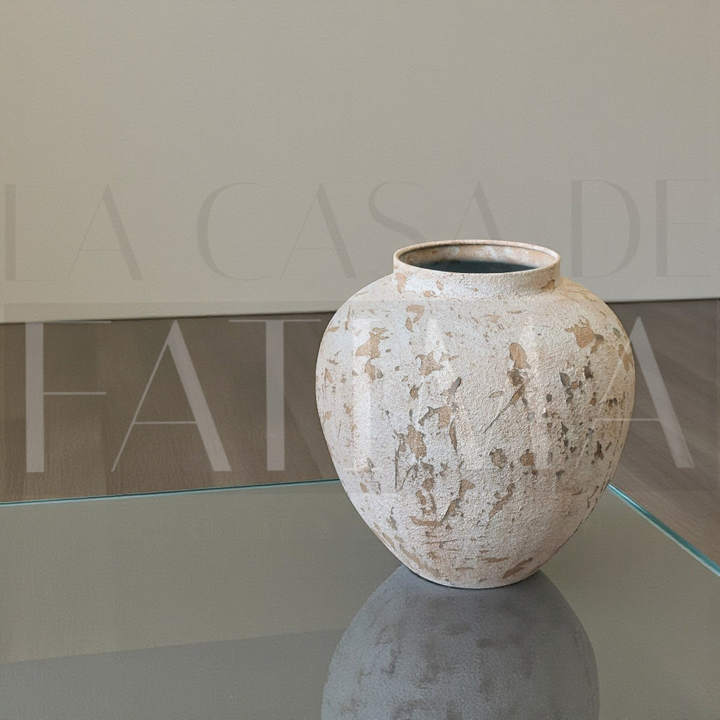 Eleva cualquier rincón con este jarrón de metal de líneas orgánicas y acabado envejecido en tonos arena. Su textura mate tipo “cemento/piedra” aporta carácter y calidez, perfecto para un living, recibidor o dormitorio de estilo mediterráneo, rústico chic o wabi-sabi.