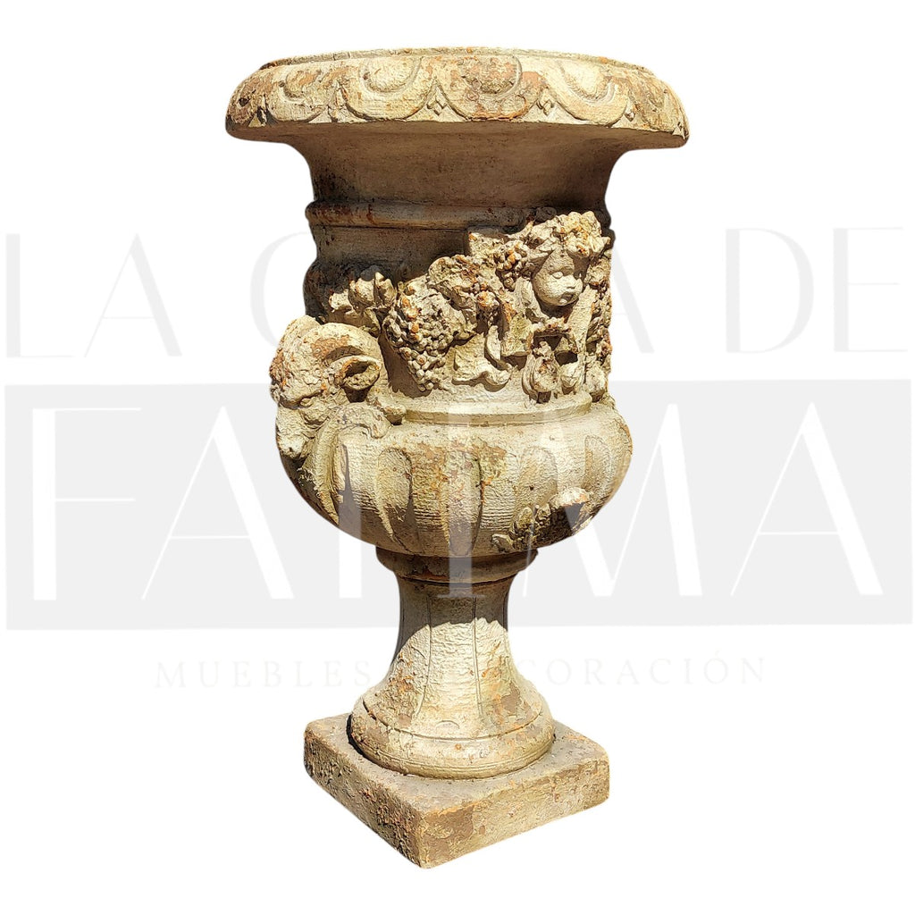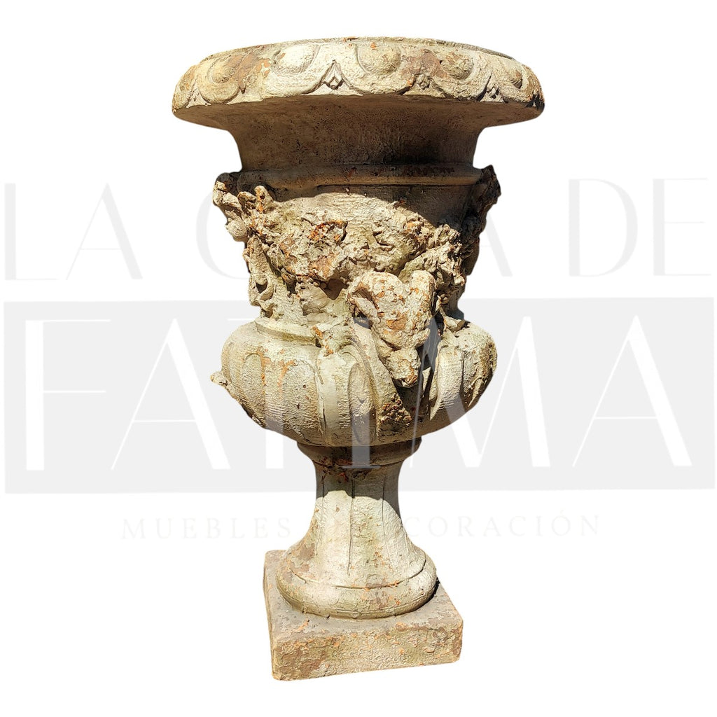 Sus relieves ornamentales y pedestal integrado realzan cualquier arreglo —ideal para entradas, terrazas techadas o salones con aire clásico.