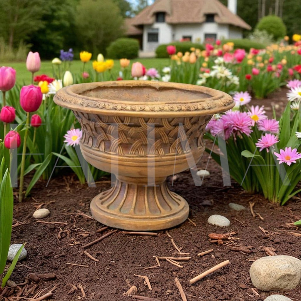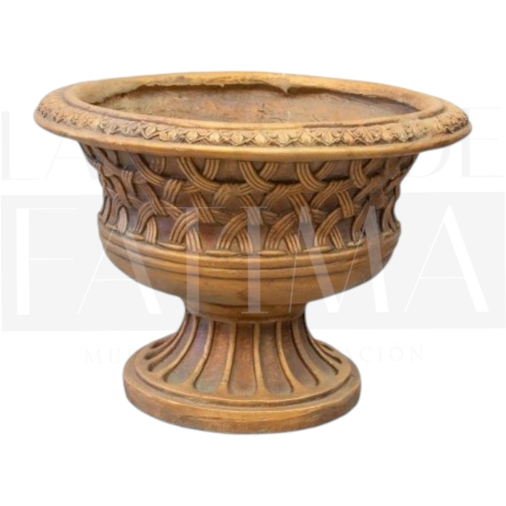 Elegancia clásica para tu casa o jardín. Esta maceta de poliresina luce un acabado dorado envejecido y un relieve entramado que resalta la forma de copa sobre pedestal.