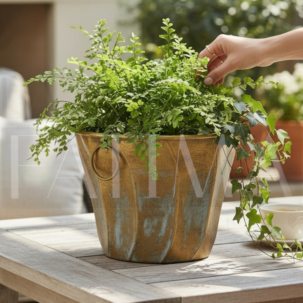 Aporta brillo y textura con esta maceta metálica dorada de look envejecido y aros laterales para moverla fácil. Ideal para entrada, living o terraza techada con pampas, eucalipto o plantas artificiales.