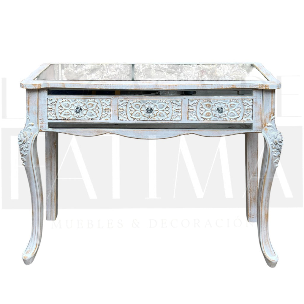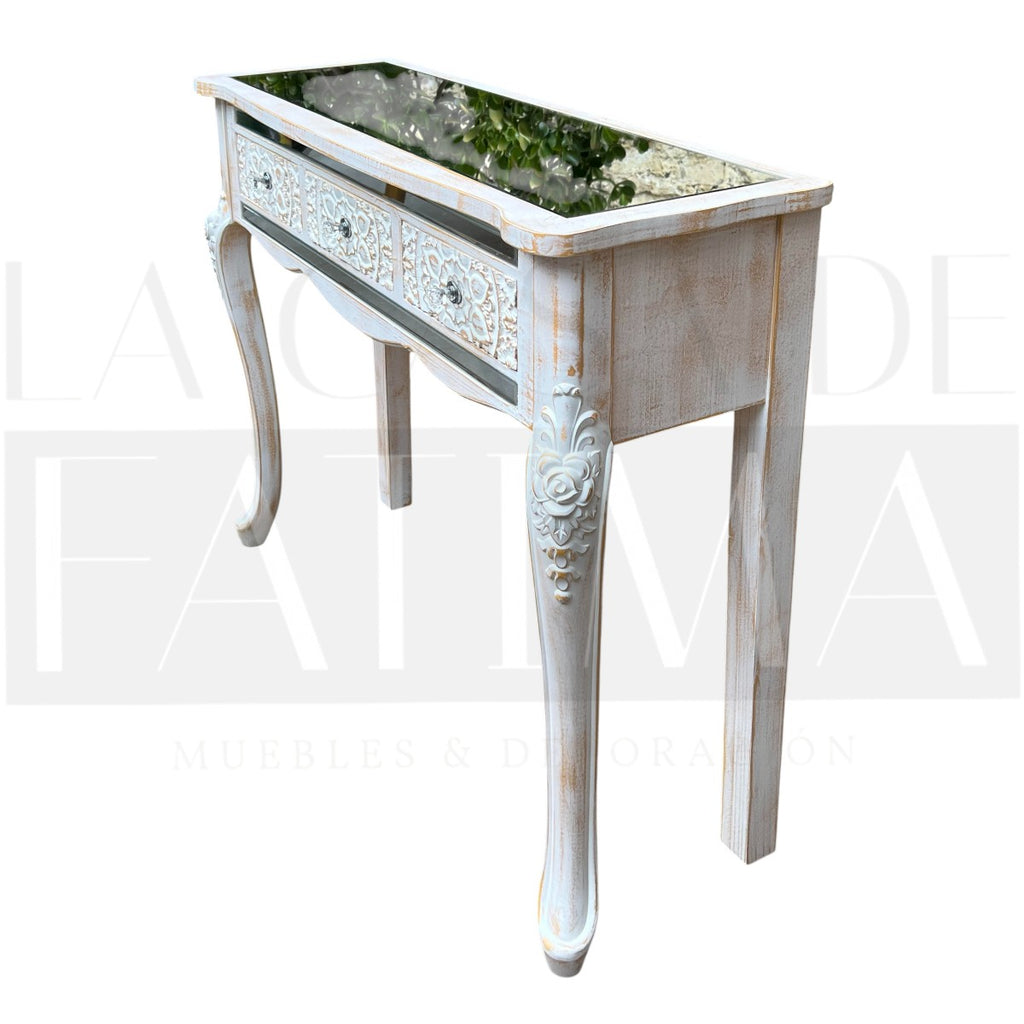 Dale entrada y personalidad a tu hogar con este arrimo de líneas clásicas y acabado decapado. Su cubierta espejada potencia la luz del ambiente, mientras los relieves florales y patas curvas aportan ese encanto provenzal que nunca pasa de moda.