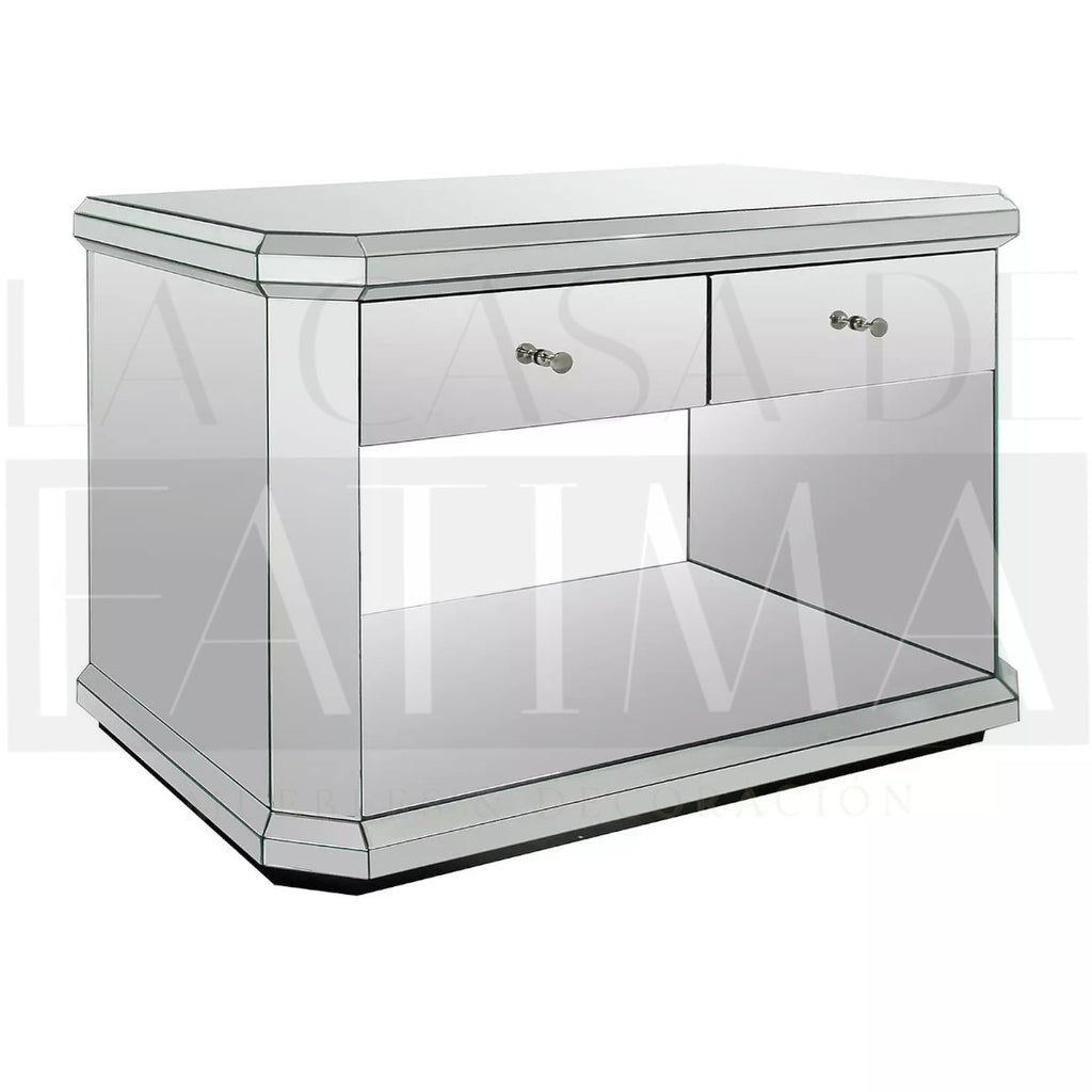 Frente y laterales revestidos en espejo con cantos biselados: acabado limpio y muy decorativo.