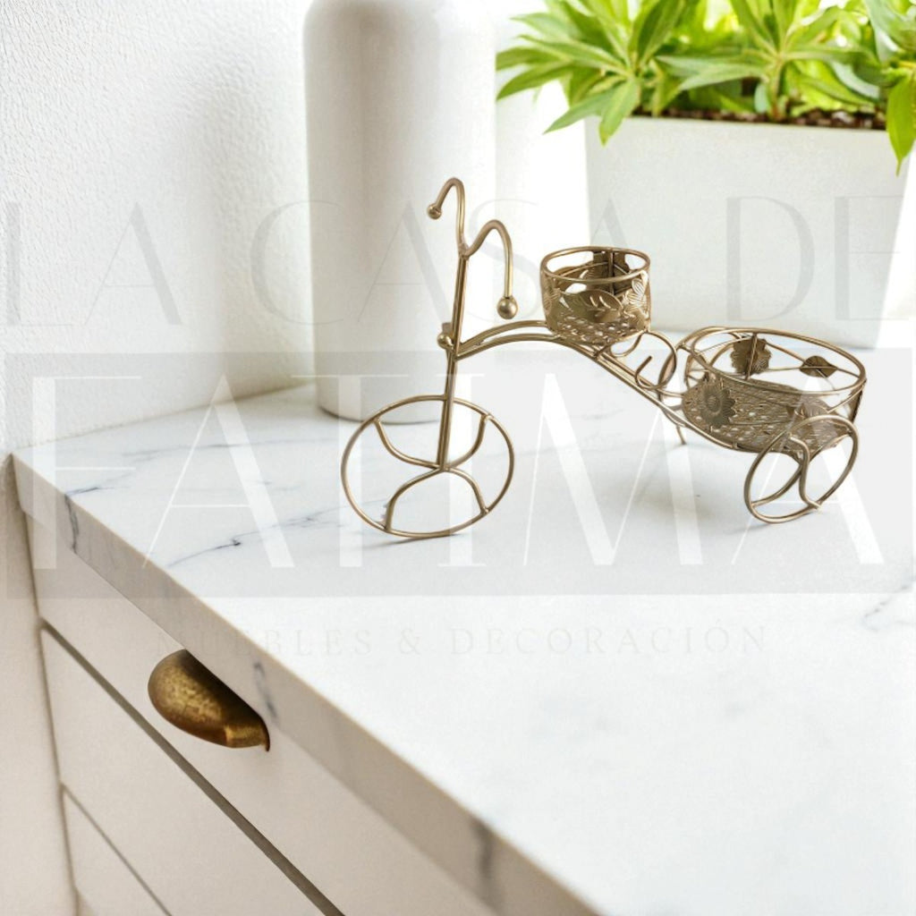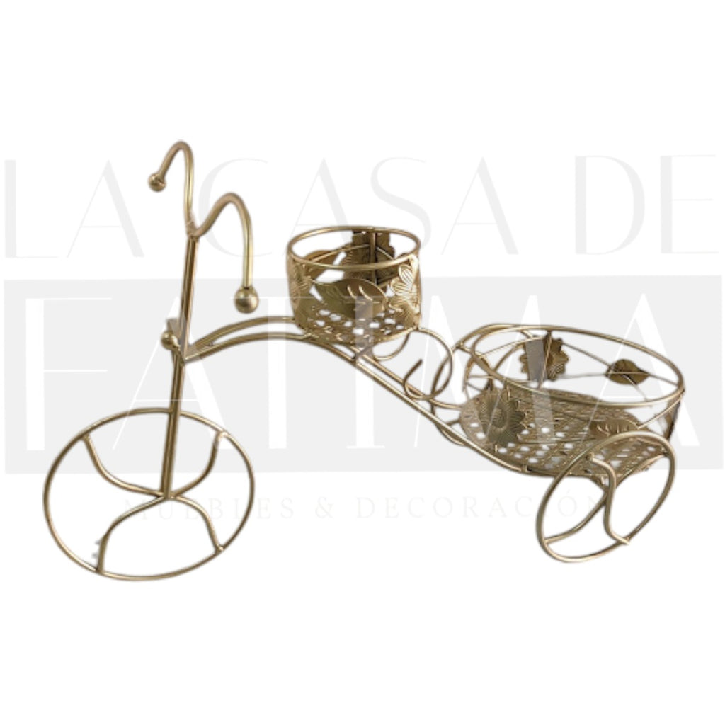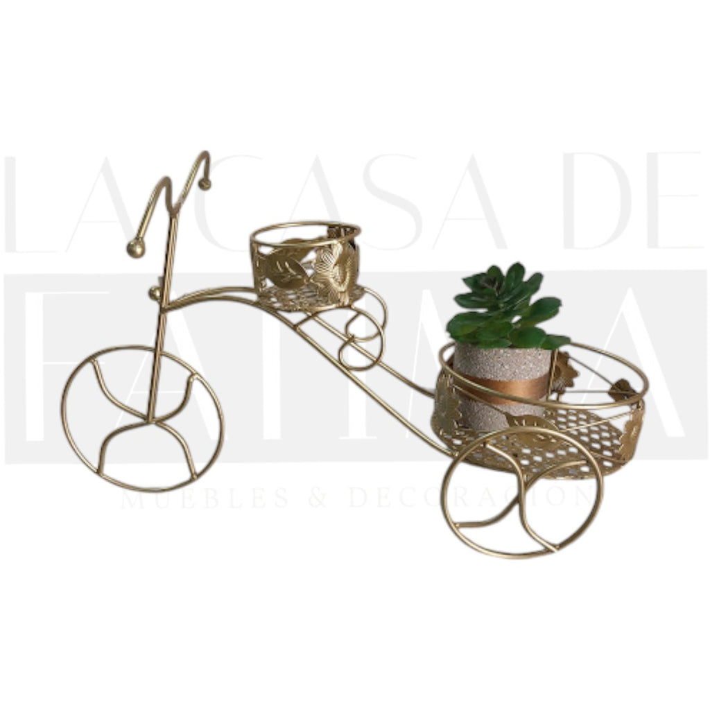 Dale un toque chic a tus plantas con este porta maceta en forma de triciclo. Su estructura metálica con acabado dorado luce elegante y liviana, ideal para realzar suculentas, cactus o florales en repisas, consolas o mesas auxiliares.