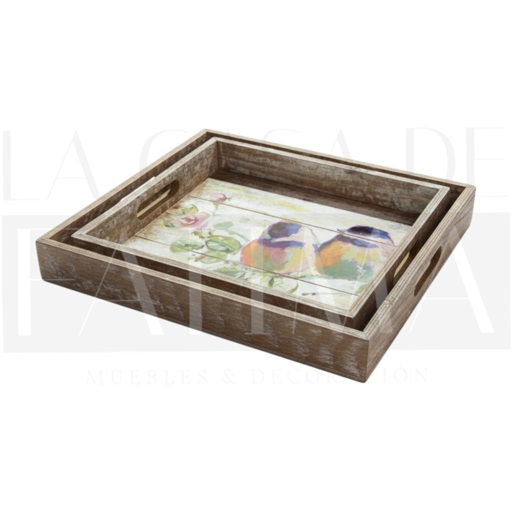 Dale un toque cálido y encantador a tu hogar con este hermoso set de 2 bandejas de madera con diseño de aves y flores. Su estilo rústico/vintage las convierte en el complemento perfecto para decorar y servir con personalidad en living, comedor, dormitorio o terraza techada.