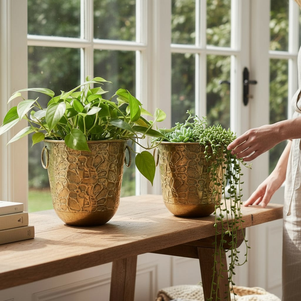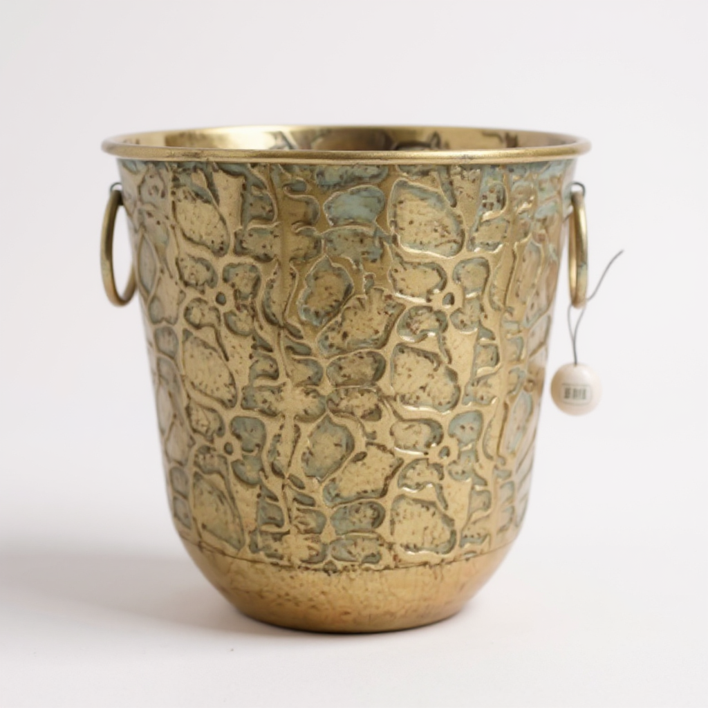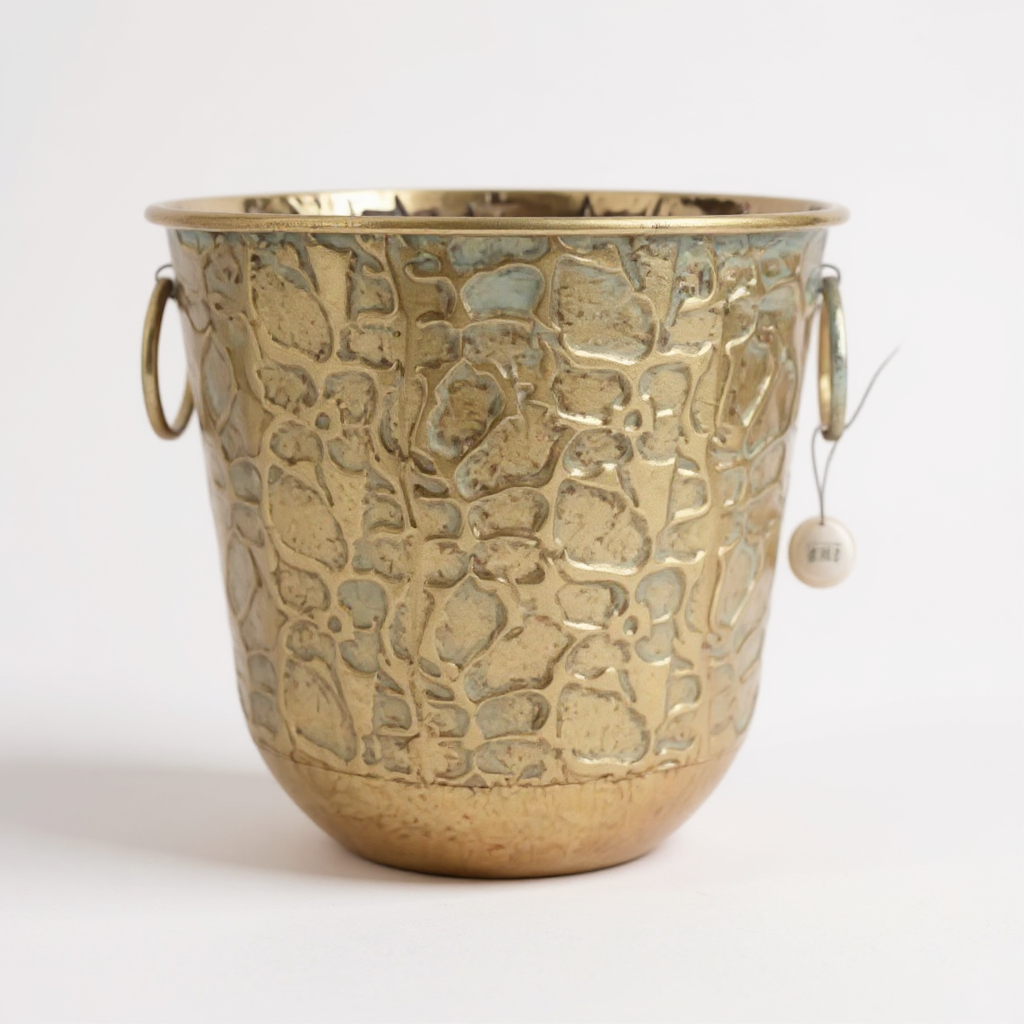 Ilumina tus rincones con este set de macetas metálicas doradas de textura artesanal y aros laterales para mover con facilidad. Quedan increíbles en la entrada, living o terraza techada con pampas, eucalipto o plantas artificiales.