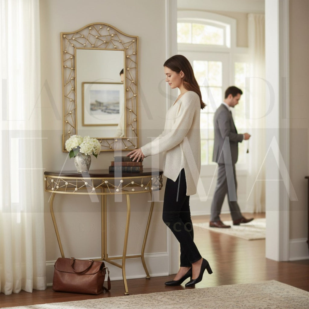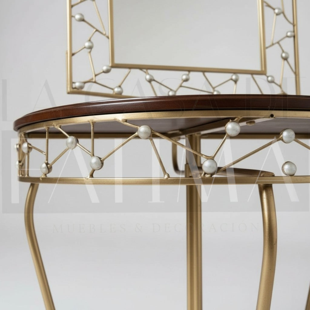 Una dupla elegante para dar la bienvenida a tu hogar. El arrimo semicircular luce una estructura metálica en acabado dorado y cubierta en tono nogal, con detalle ornamental tipo “perlas” que aporta brillo sutil. El espejo medialuna a juego repite el trabajo del marco para un look coordinado y luminoso.