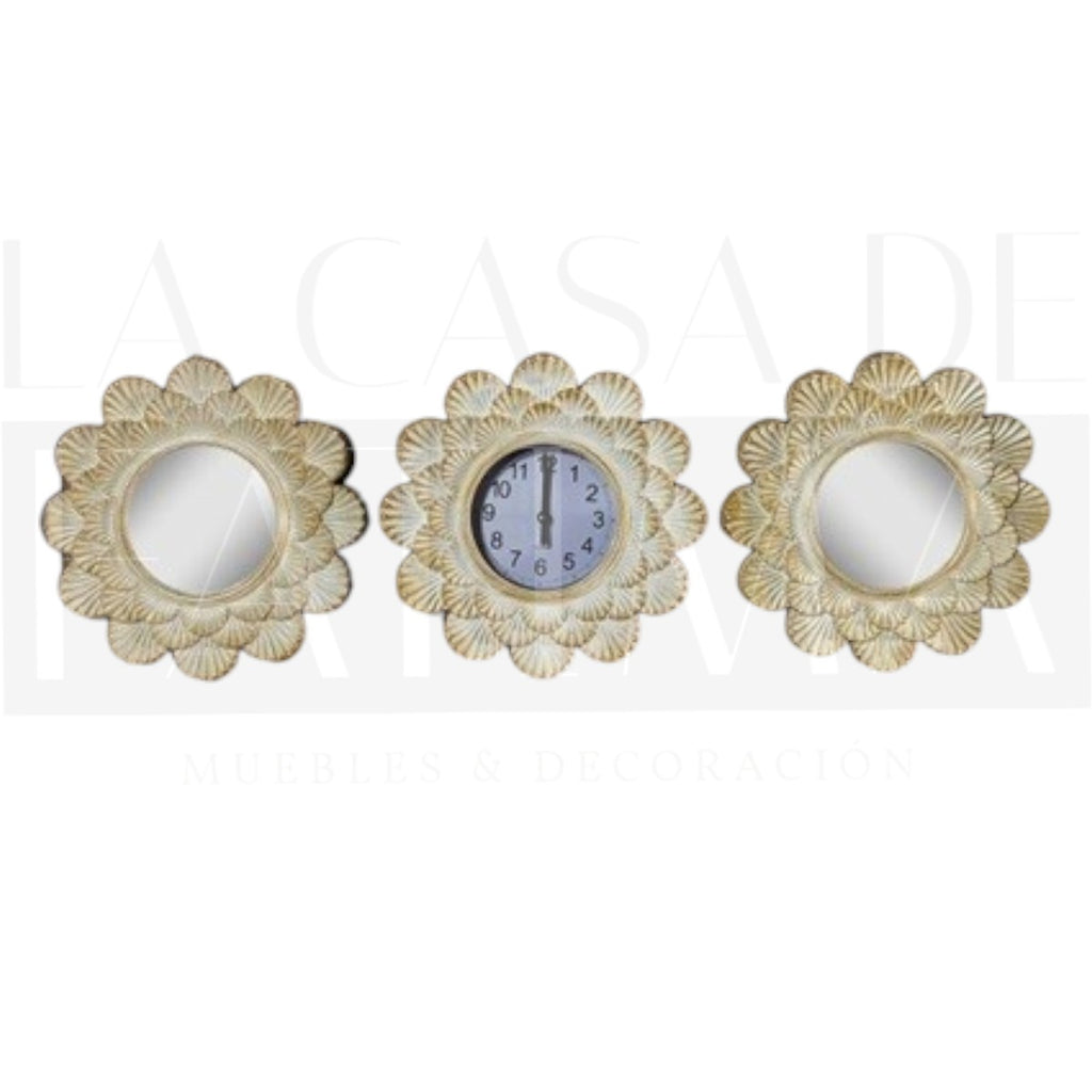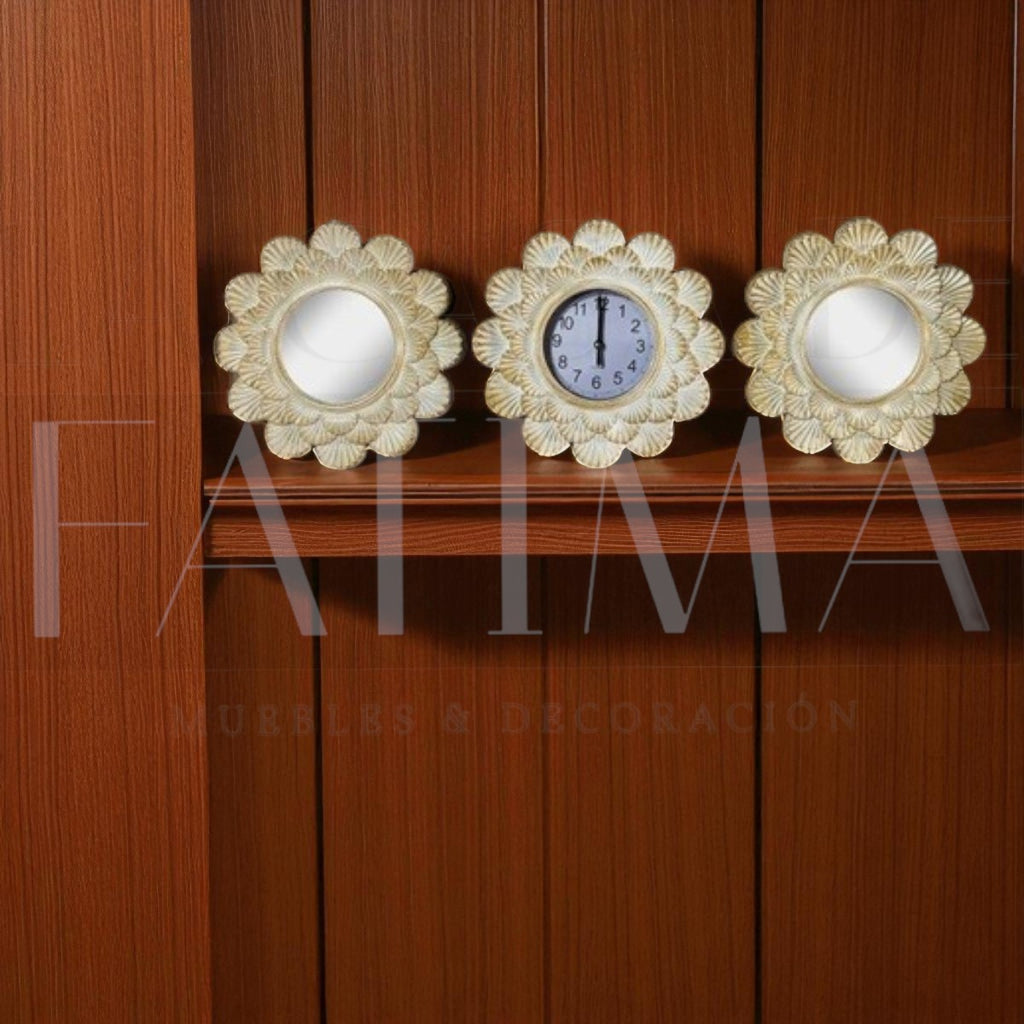 Ilumina tu pared con este set compuesto por 1 reloj y 2 espejos a juego. El marco blanco con relieve tipo pétalos aporta encanto vintage, mientras el espejo realza la luz del ambiente. Ideal para recibidor, dormitorio o living.
