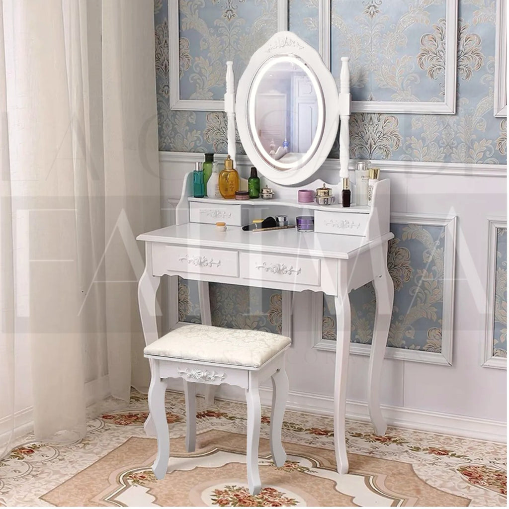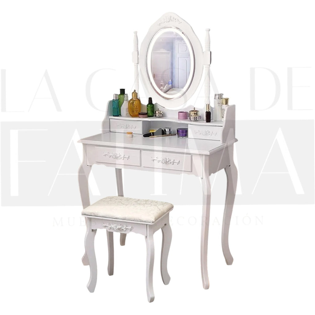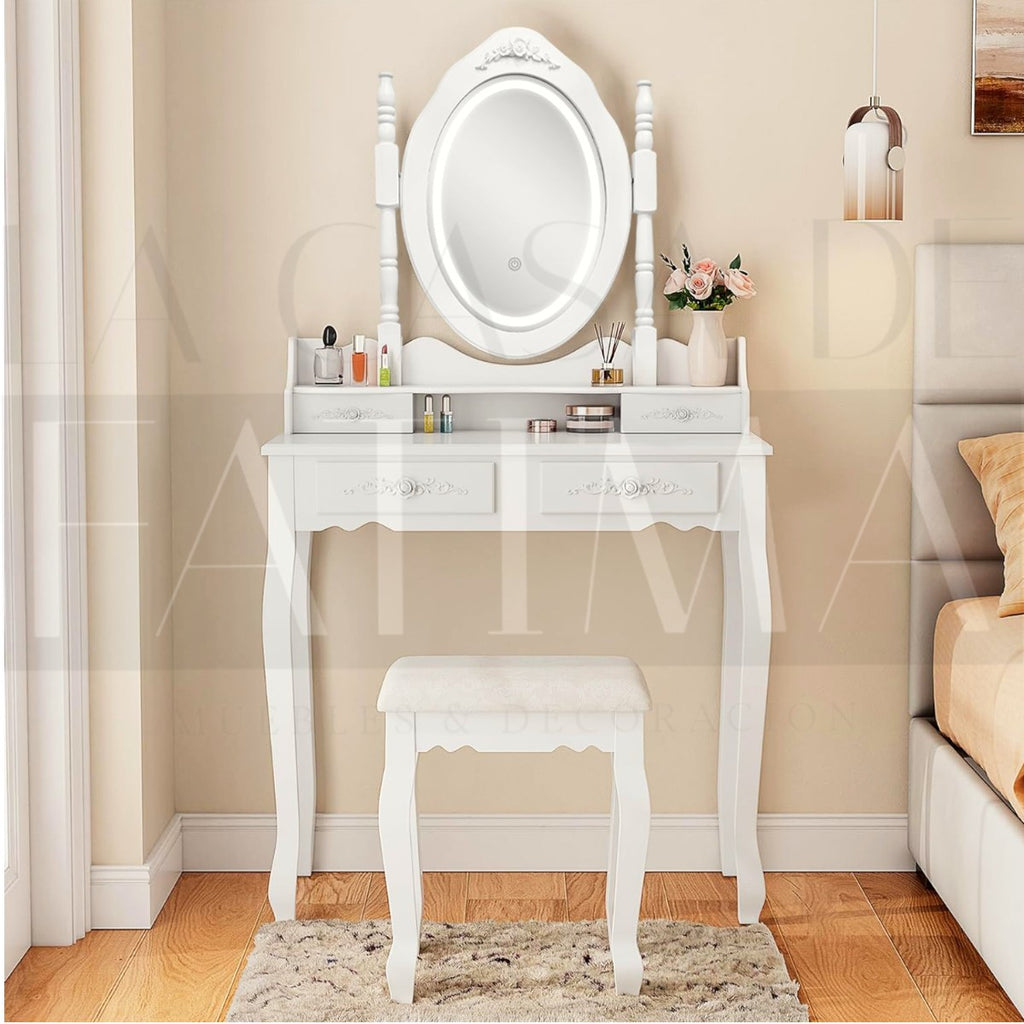 Eleva tu rutina de belleza con un tocador de estilo romántico y funcionalidad moderna. Su estructura en MDF blanco lacado aporta luminosidad y un acabado fácil de limpiar; el espejo oval con luz LED integrada ofrece 3 temperaturas de color para un maquillaje perfecto en cualquier momento del día.