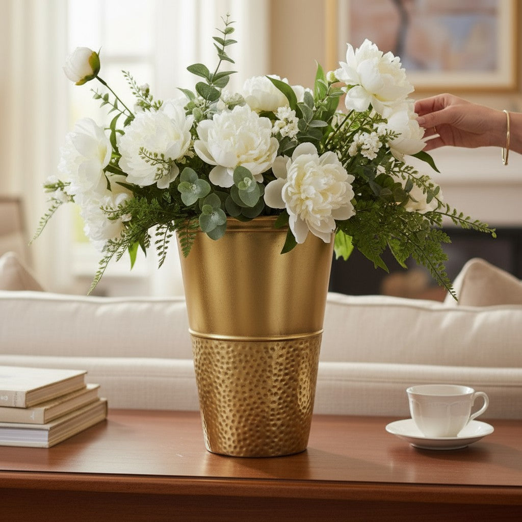 Aporta brillo y textura con esta vasija metálica dorada de diseño bicolor: liso arriba y martillado abajo. Los aros laterales facilitan moverla y lucirla en la entrada, living o terraza techada con pampas, eucalipto o flores artificiales.