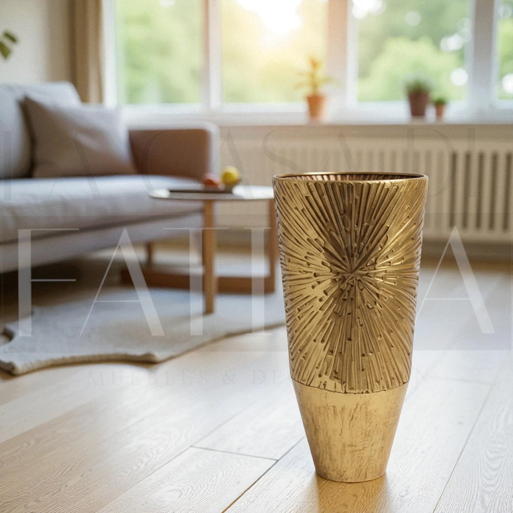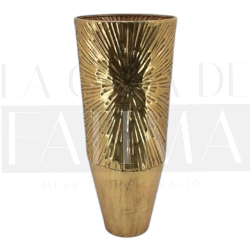 Aporta brillo y altura con esta vasija metálica dorada de textura radial tipo sol. Su formato escultural luce perfecta en el piso, junto a un arrimo o flanqueando un espejo.