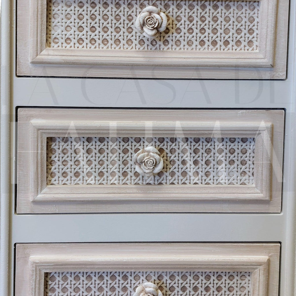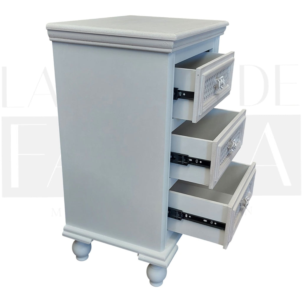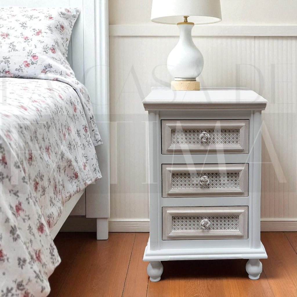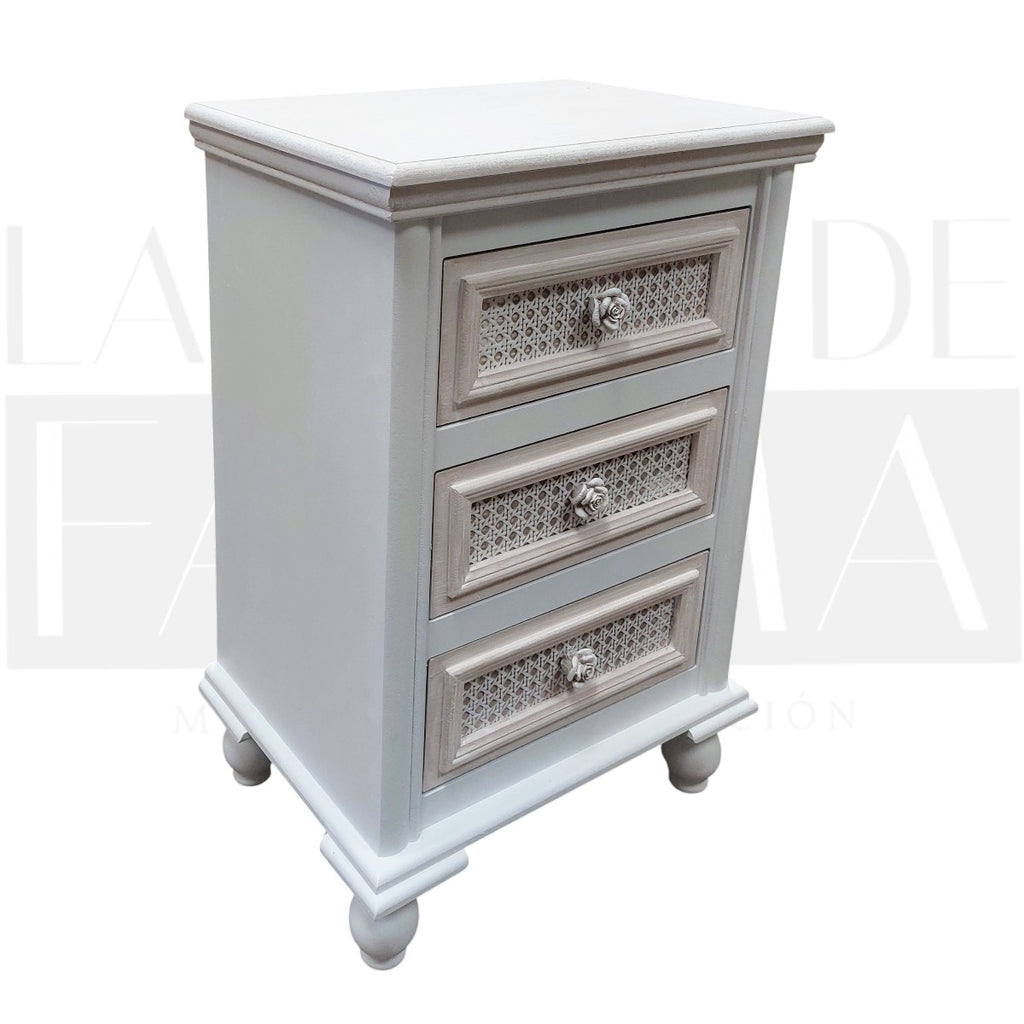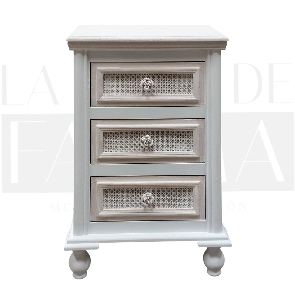 Dale un toque romántico y ordenado a tu espacio con este velador de líneas provenzales. Su frente de cajones con aplicaciones de junco y tiradores de madera en forma de rosa aporta textura y calidez, mientras que la cubierta con acabado albayalde ilumina y combina fácil con distintos estilos.