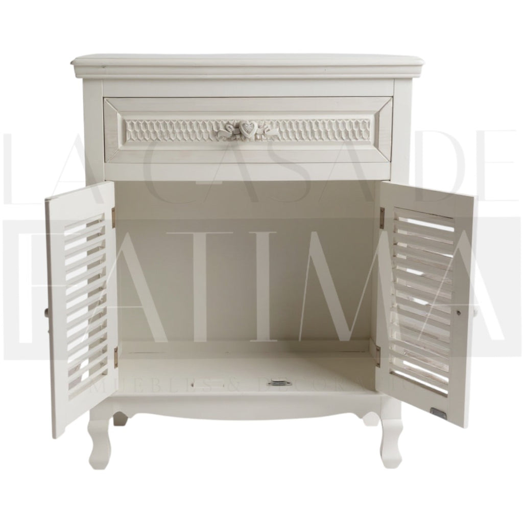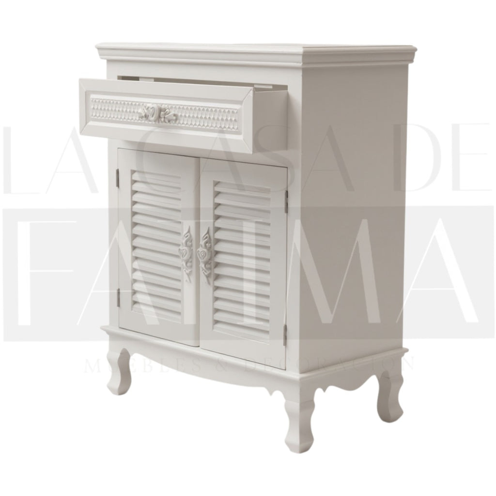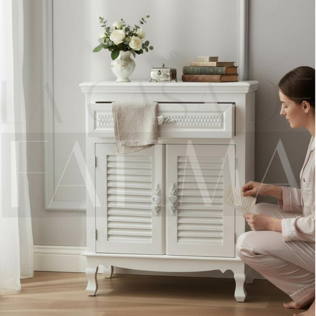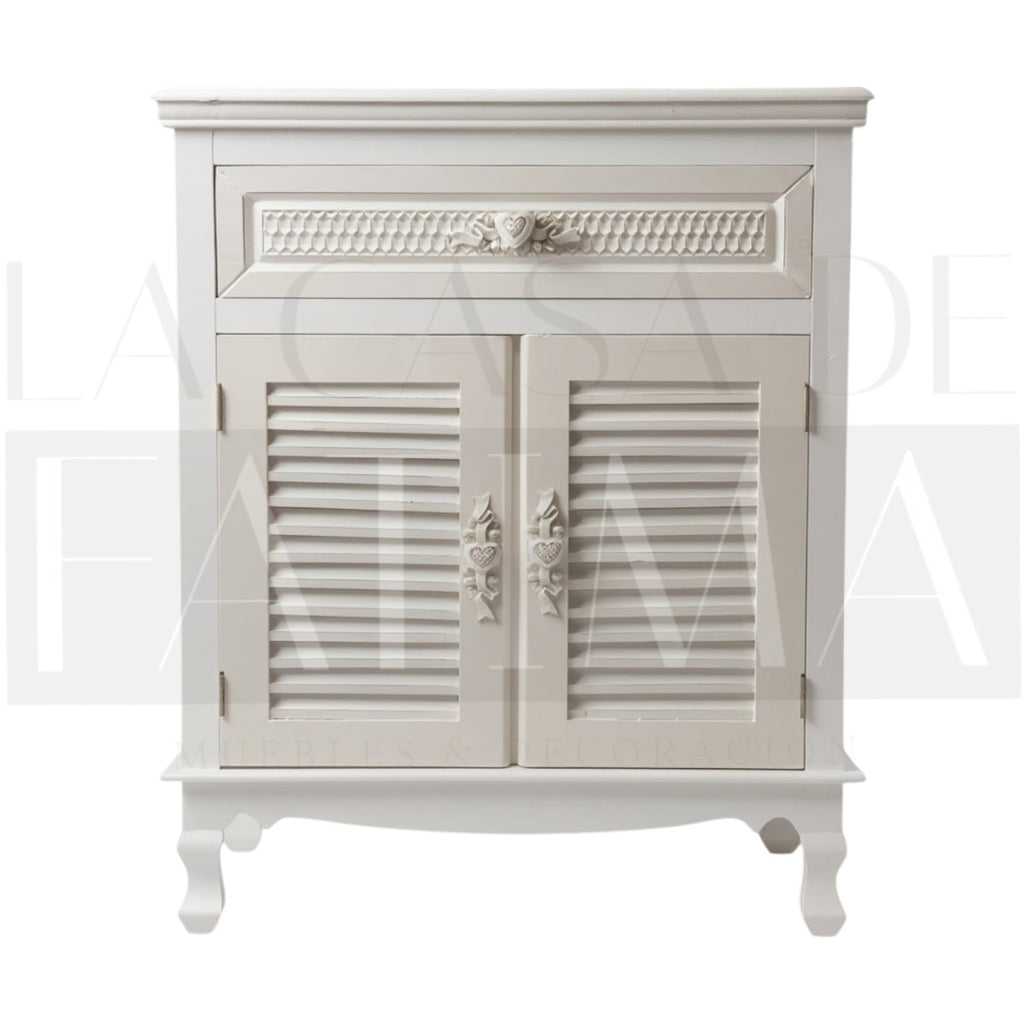 Sus puertas con diseño tipo persiana y su cajón superior texturizado con relieves decorativos le otorgan un look único y artesanal, mientras que sus suaves tonos neutros lo hacen fácil de combinar con distintos estilos de interior.