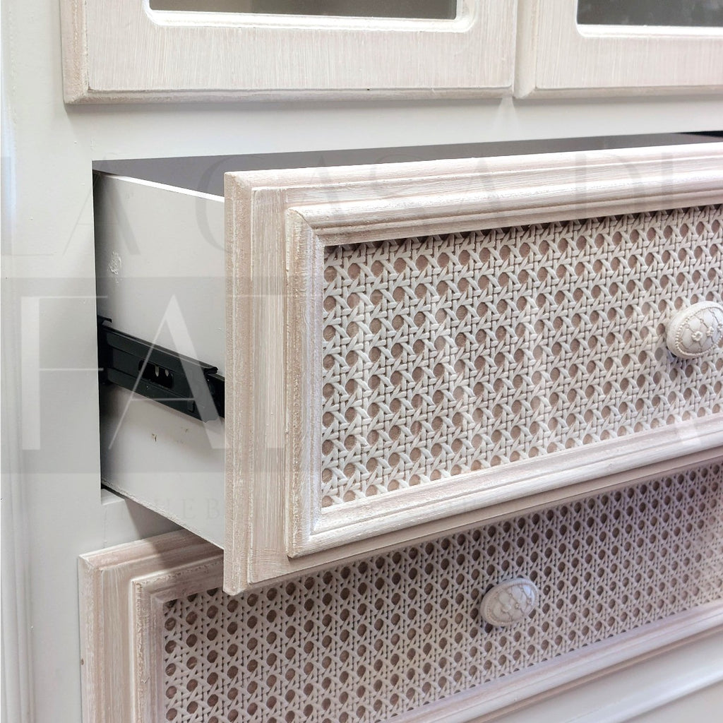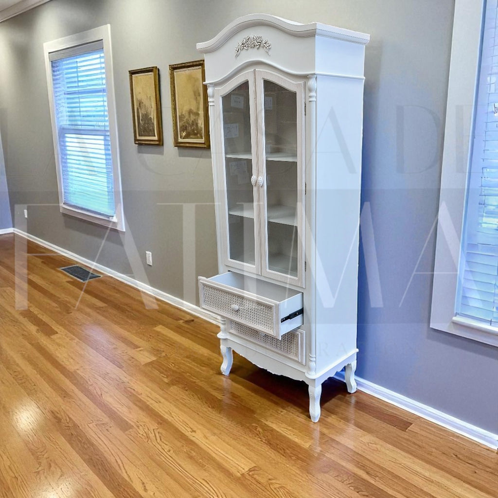 Eleva tus espacios con el encanto clásico del estilo provenzal. Esta vitrina combina líneas curvas, delicados relieves y patas cabriolé con un práctico espacio de guardado para lucir y organizar tu vajilla, libros u objetos decorativos.