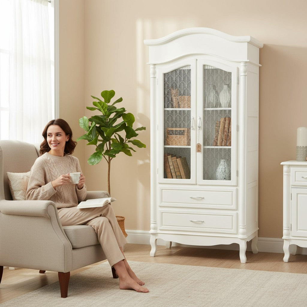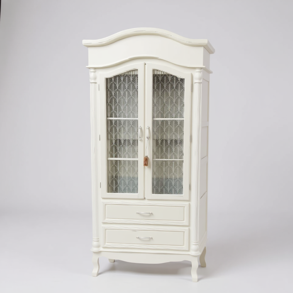 La Vitrina Provenzal Grande es una elegante vitrina con vidrio esmerilado, delicados tallados, dos amplios cajones con tiradores metálicos y patas altas.